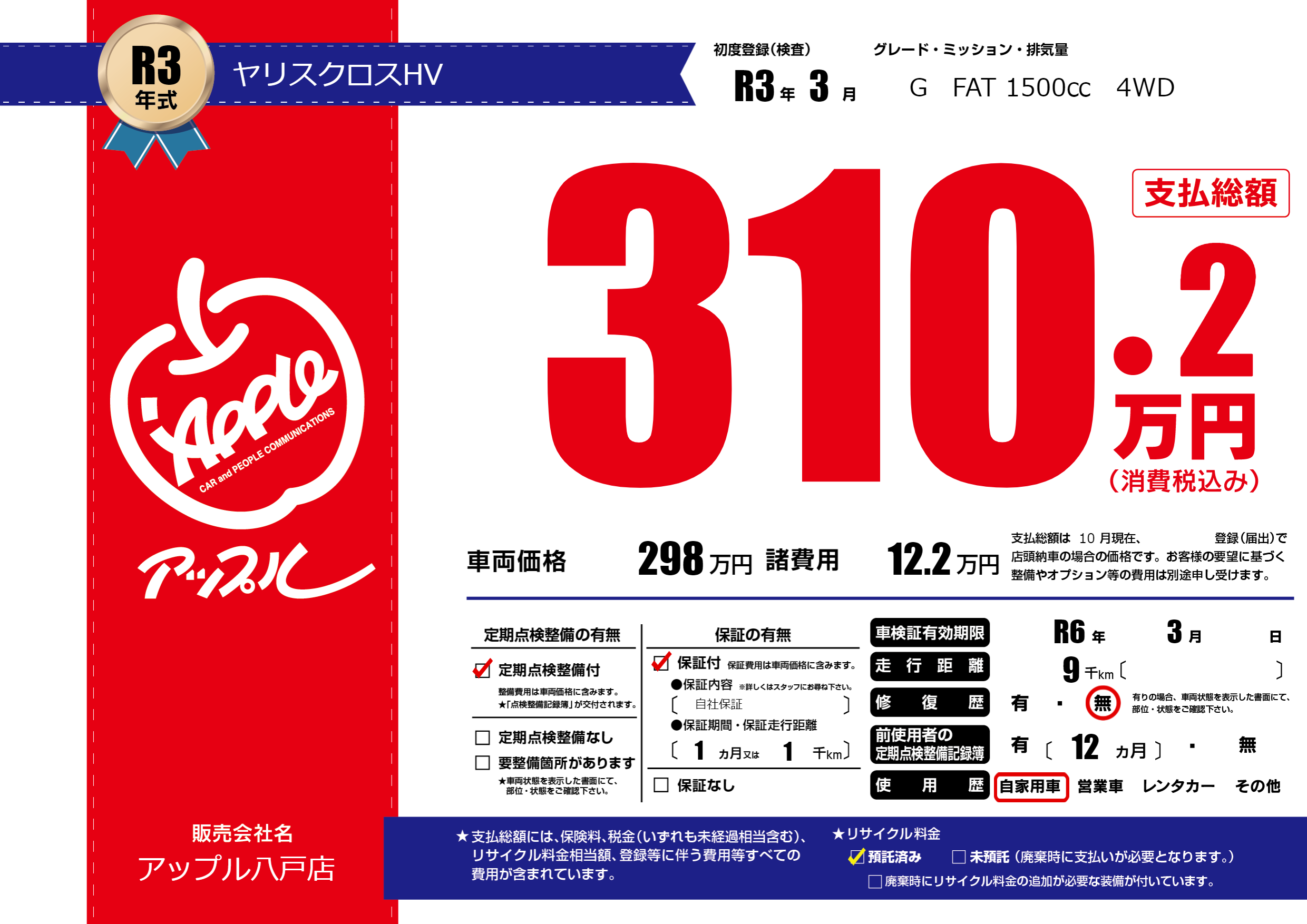 | 走行キロ | 0.9万km | 初年度登録 | R3年3月 |