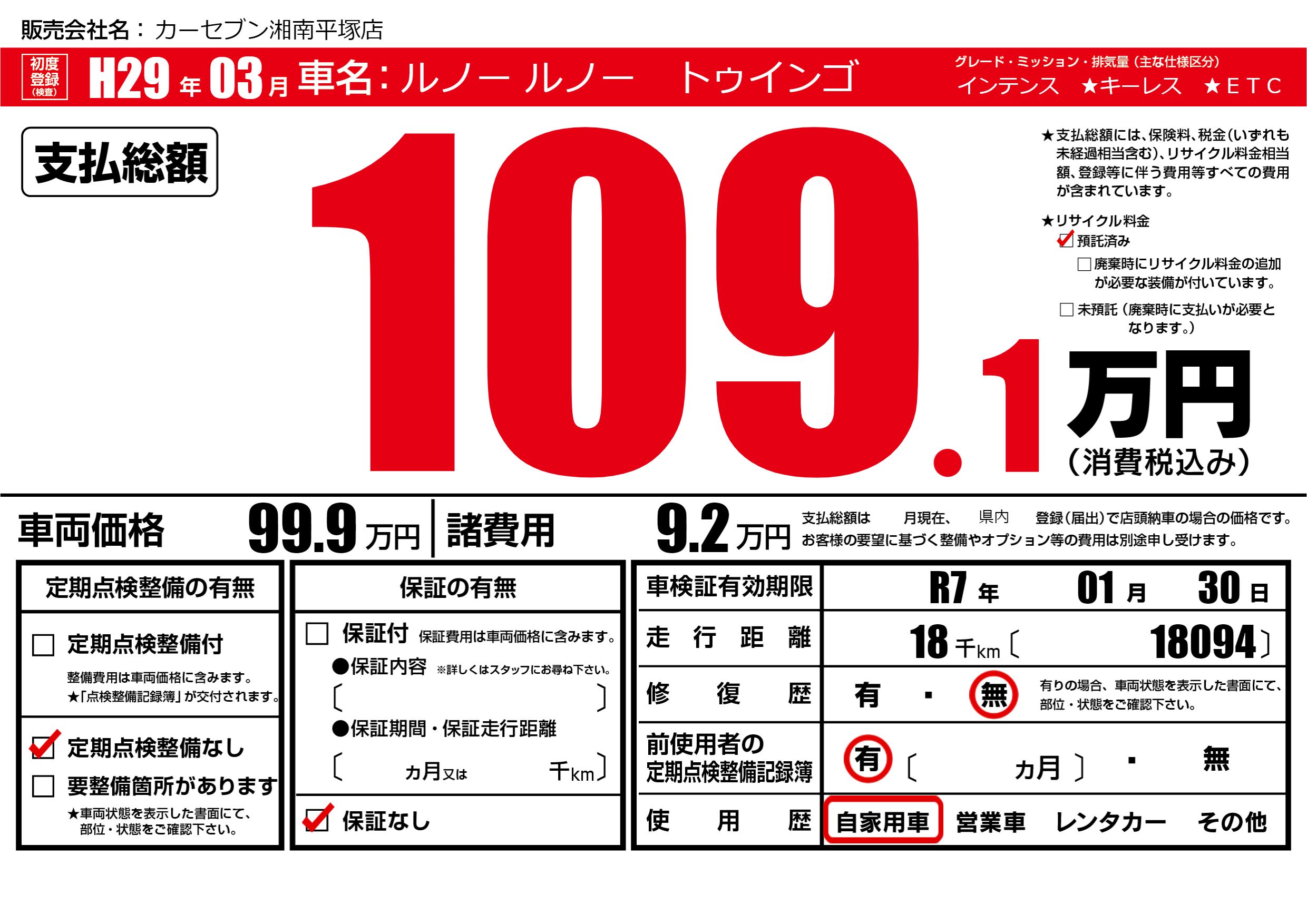 | 車名 | ルノー ルノー トゥインゴ | グレード ミッション 排気量 |