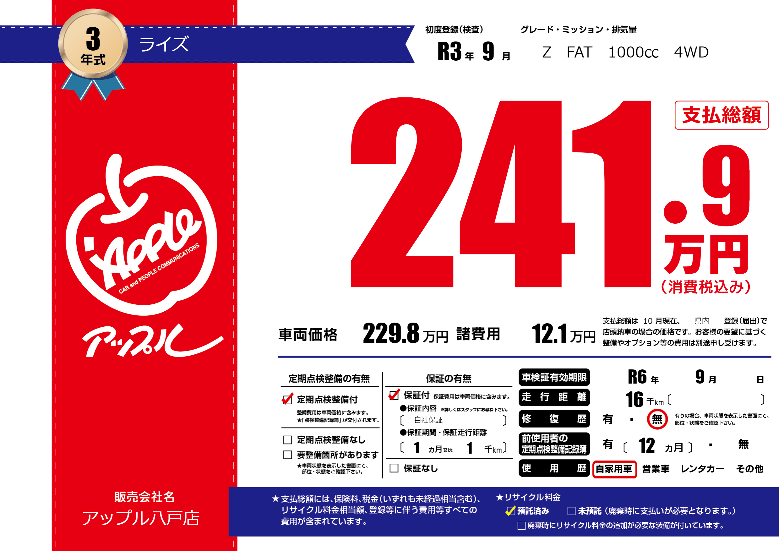 | 車検制限 | R6年 9月 - 日 | ||