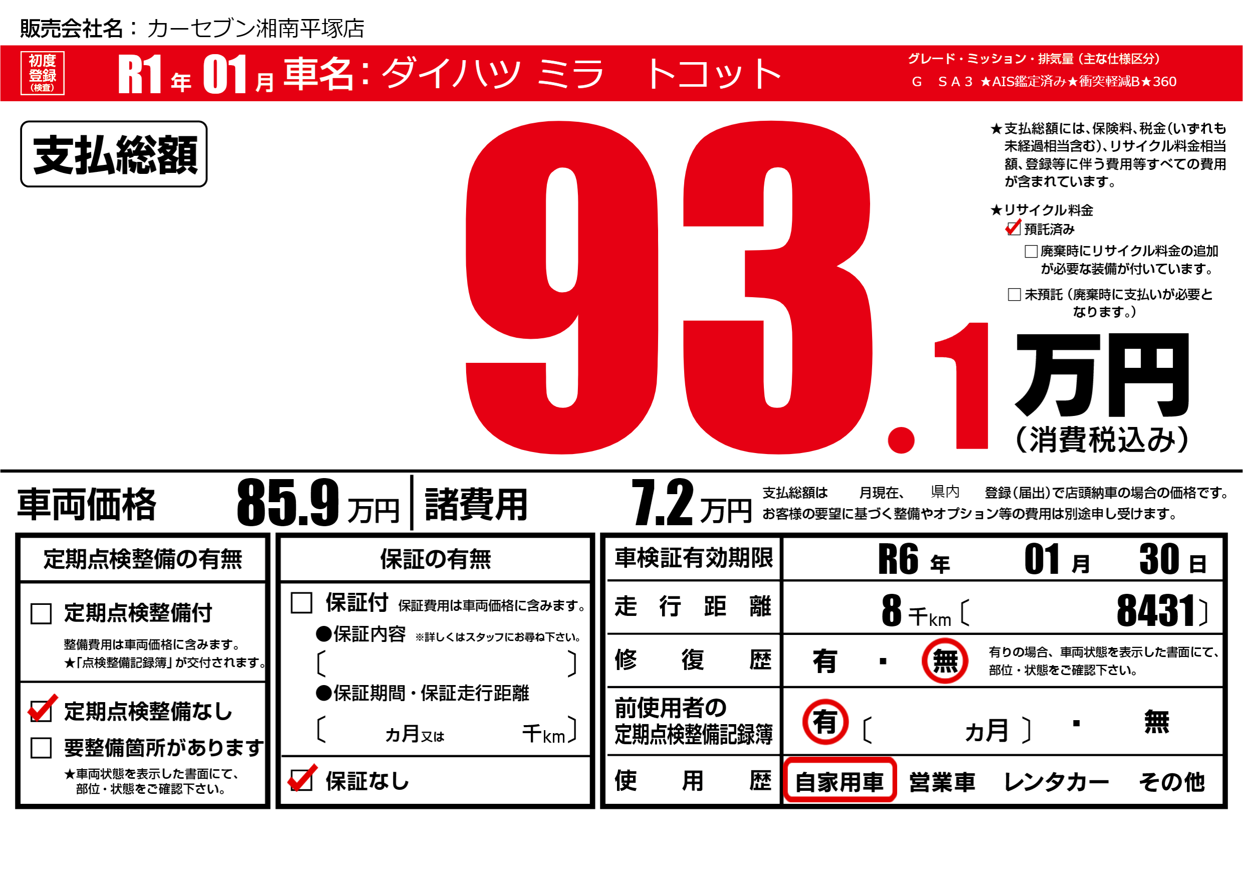 なし | 車検制限 | R6年01月30月 |