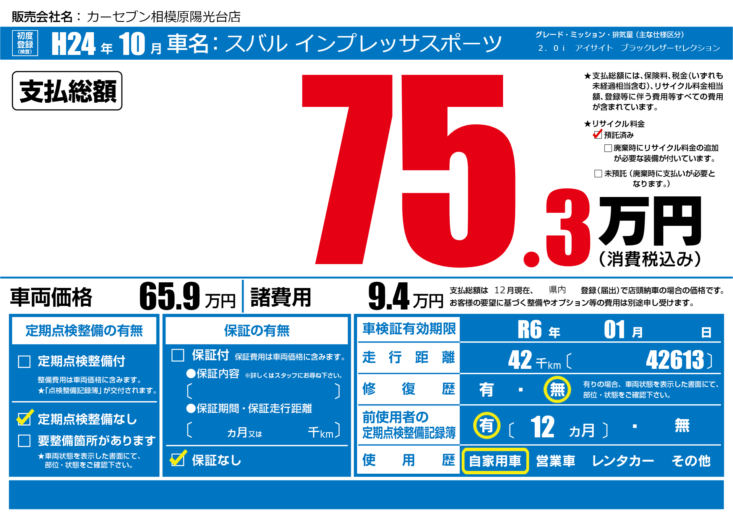 | 車名 | スバル インプレッサスポーツ | グレード ミッション 排気量 |