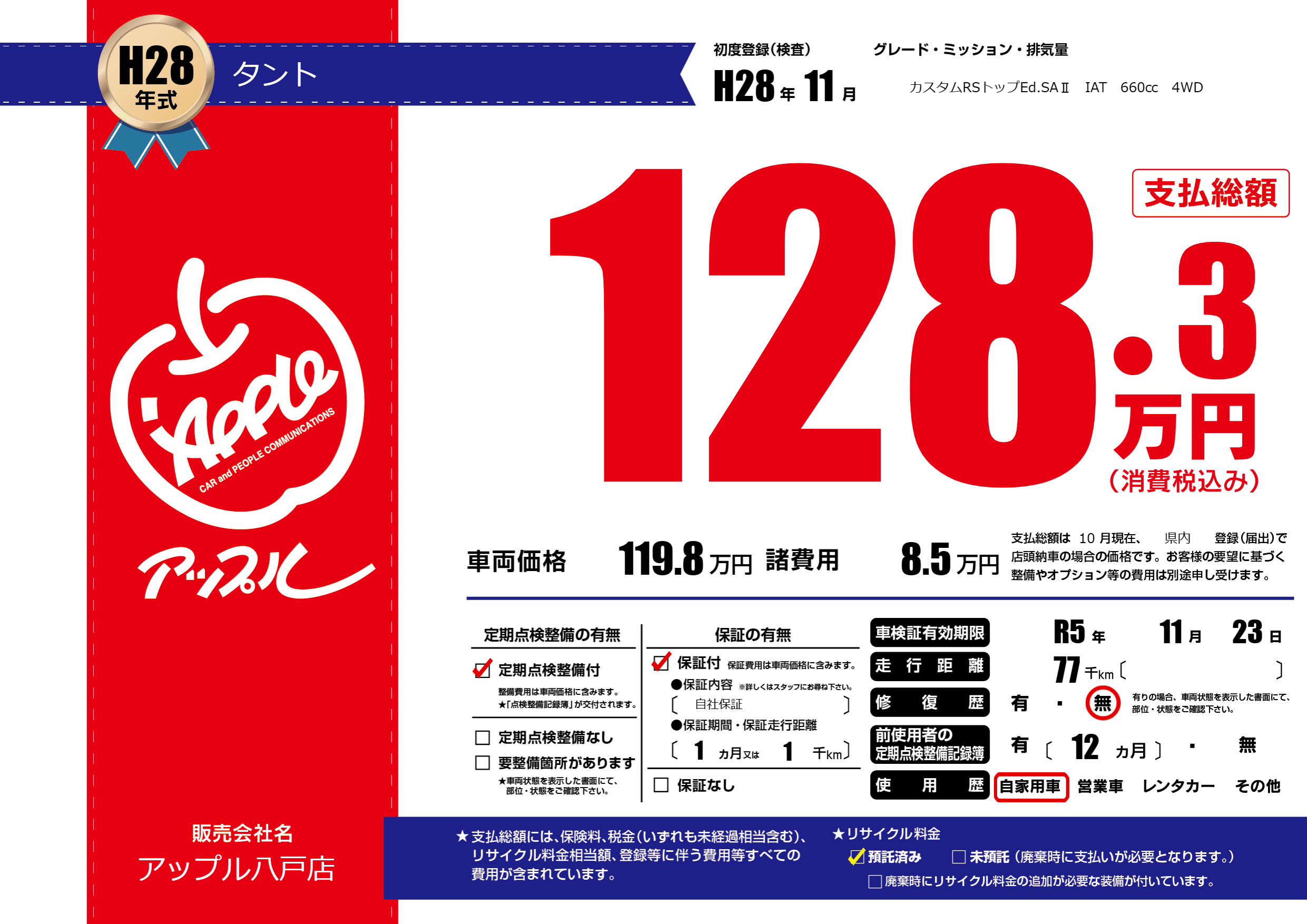 | 走行キロ | 7.7万km | 初年度登録 | H28年11月 |