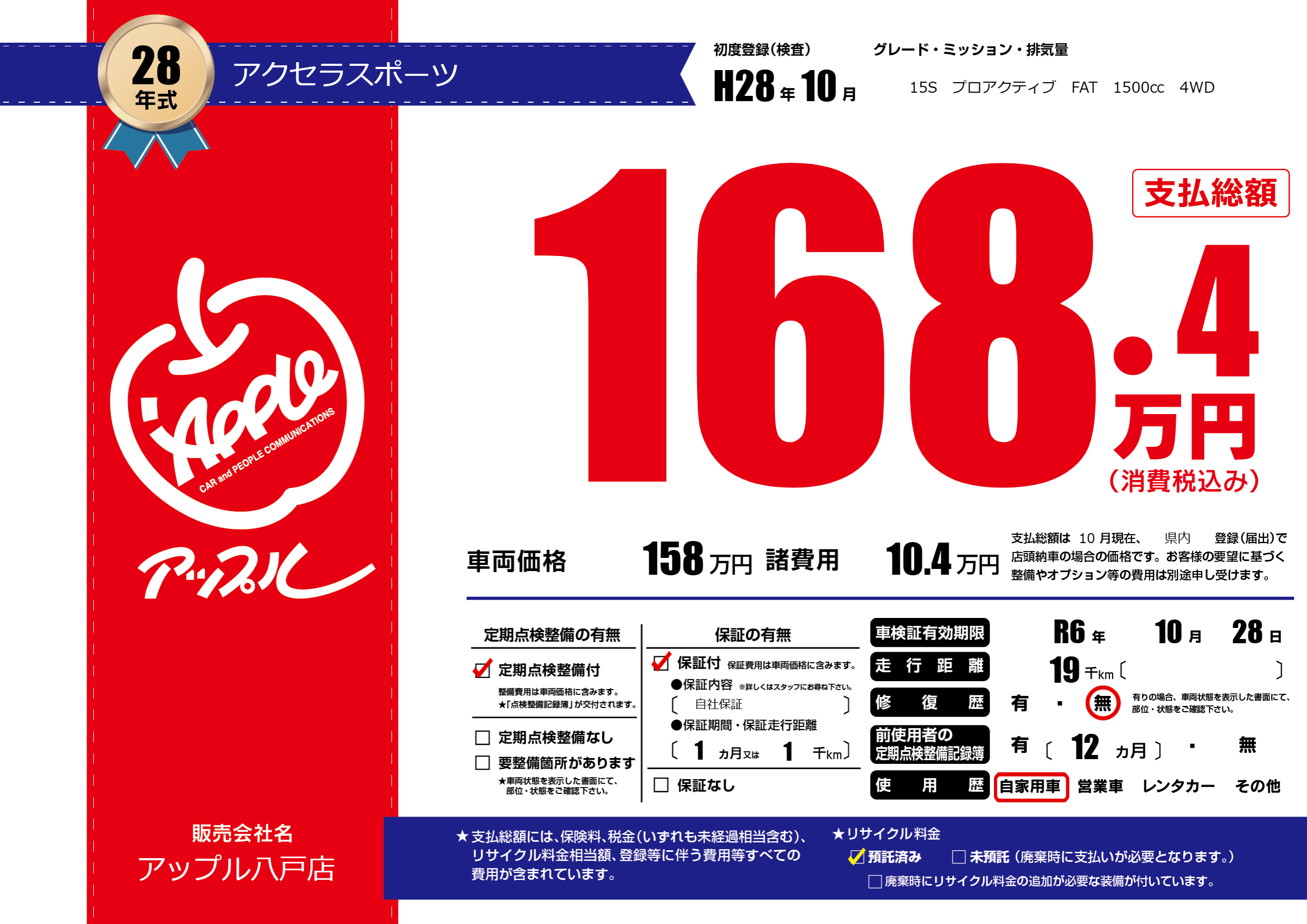 | 走行キロ | 1.9万km | 初年度登録 | H28年10月 |
