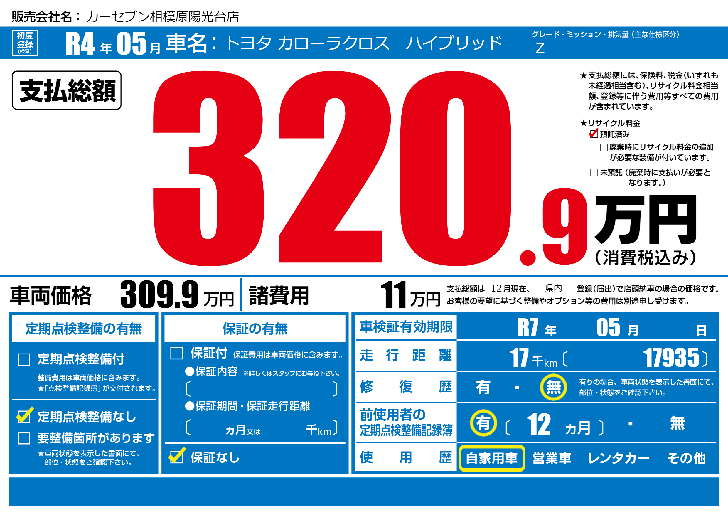 | 車名 | トヨタ カローラクロス ハイブリッド | グレード ミッション 排気量 |