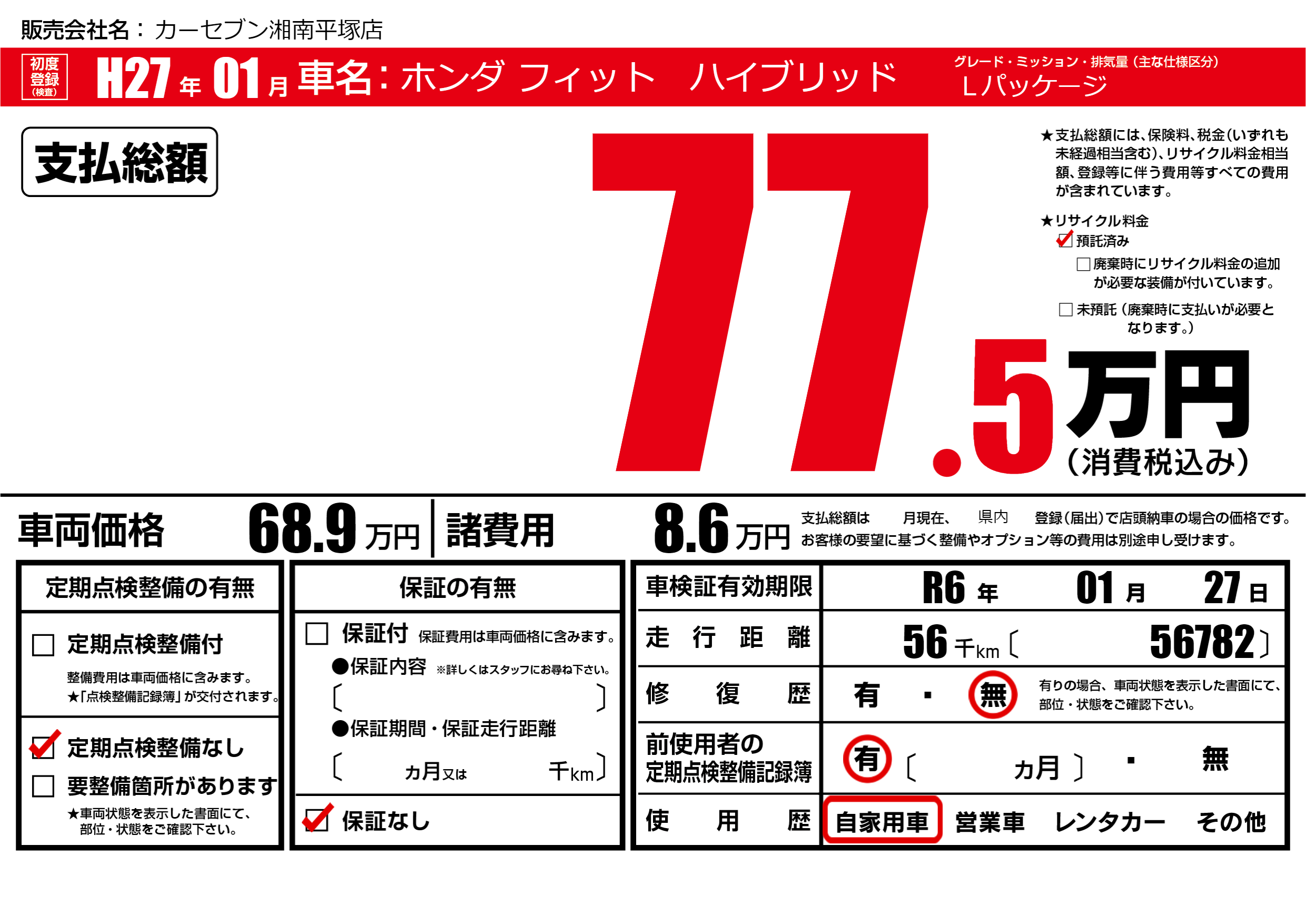 | 走行キロ | 5.6万km | 初年度登録 | H27年01月 |