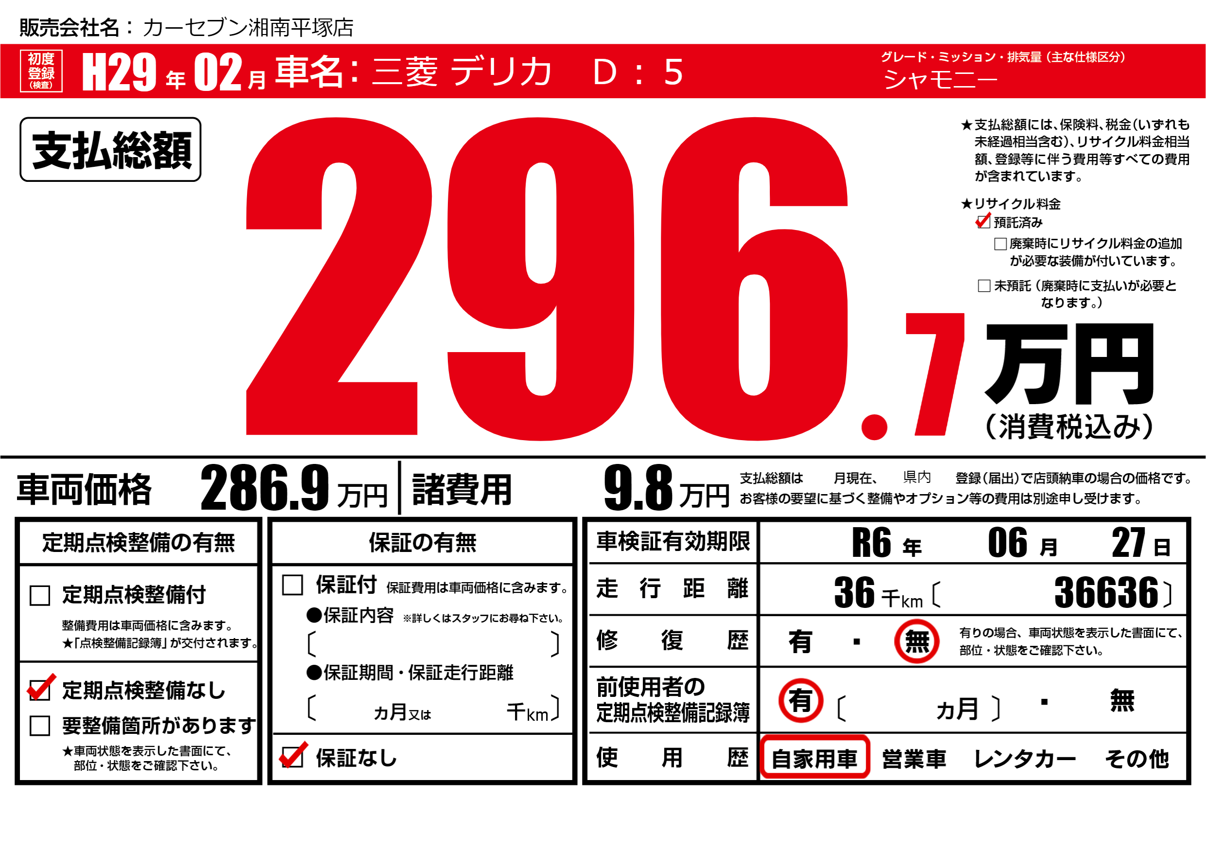 | 車名 | 三菱 デリカ D:5 | グレード ミッション 排気量 |