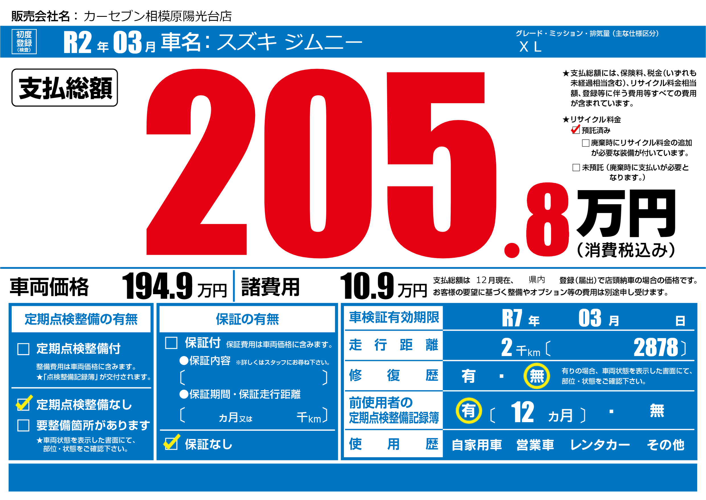 | 車名 | スズキ ジムニー | グレード ミッション 排気量 |