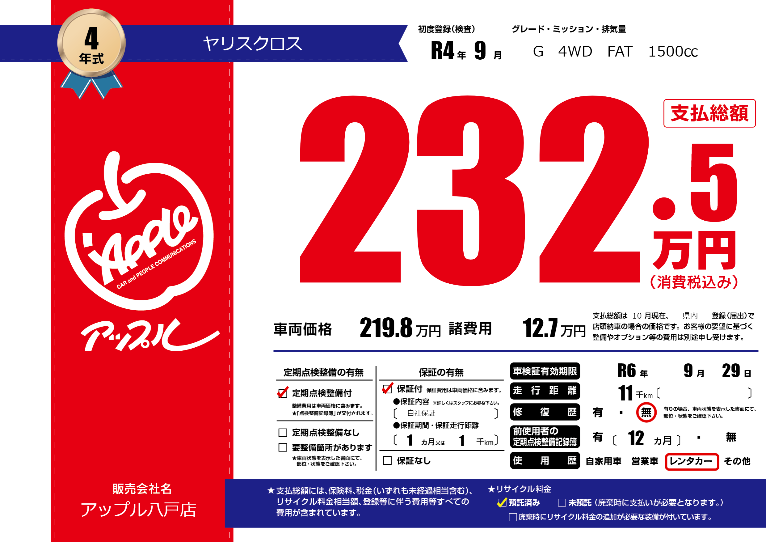 | 走行キロ | 1.1万km | 初年度登録 | R4年9月 |