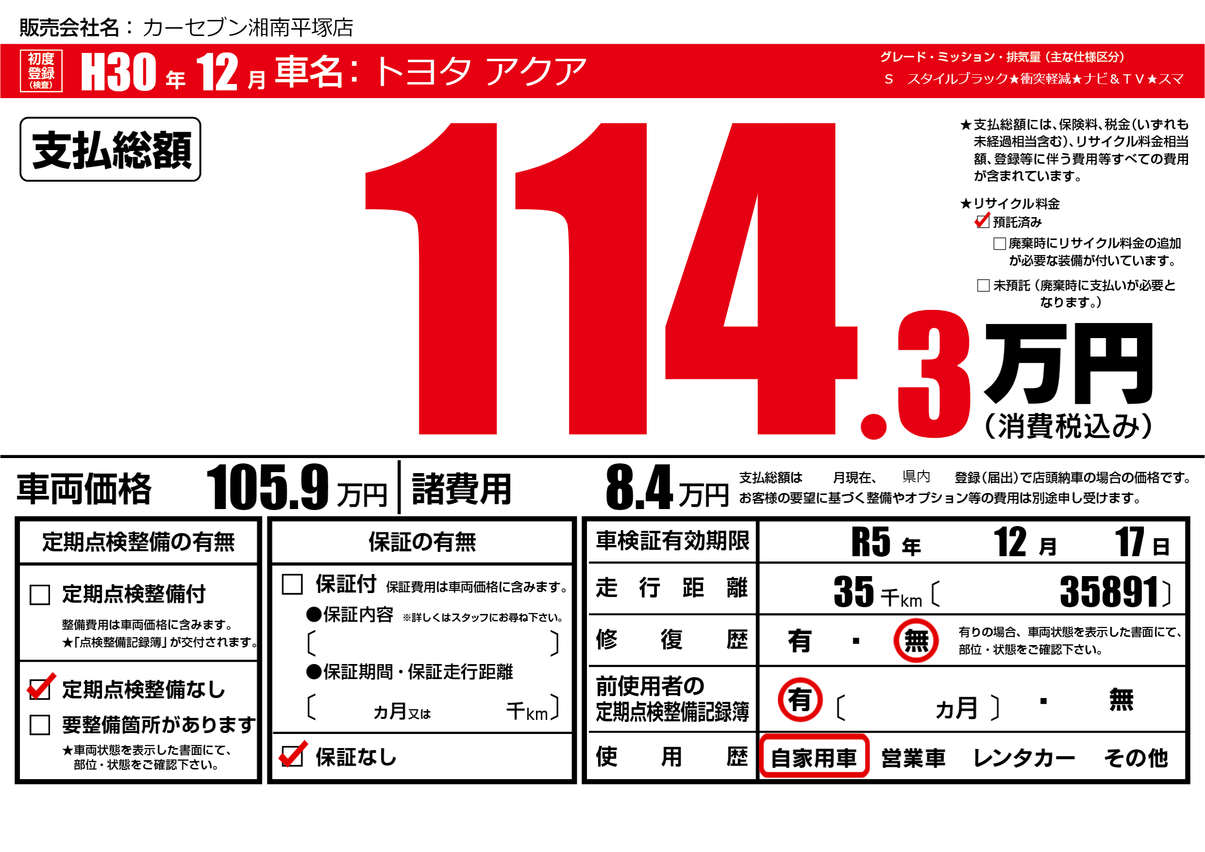 | 車名 | トヨタ アクア | グレード ミッション 排気量 |