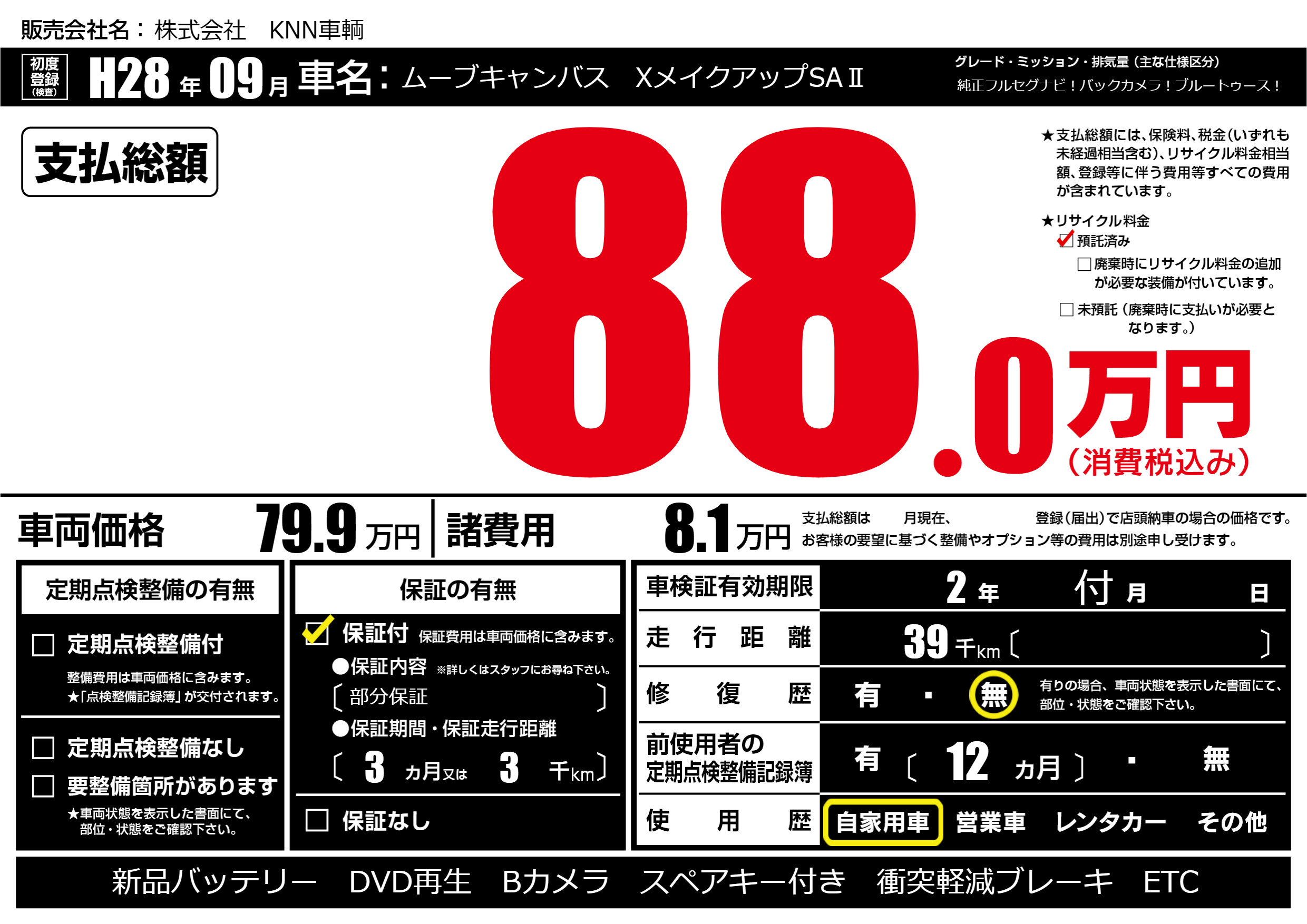 | 走行キロ | 3.9万km | 初年度登録 | H28年09月 |