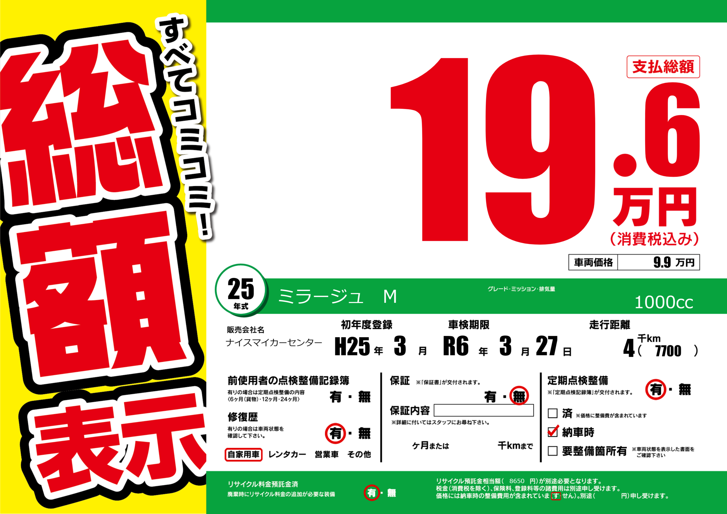 | 定期点検整備 | 定期点検整備あり 納車時あり | ||