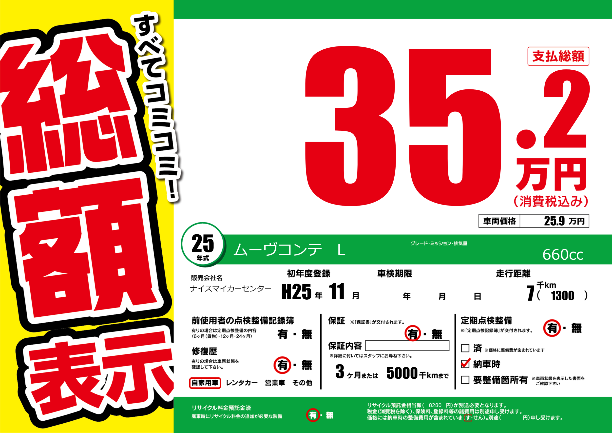 | 定期点検整備 | 定期点検整備あり 納車時あり | ||