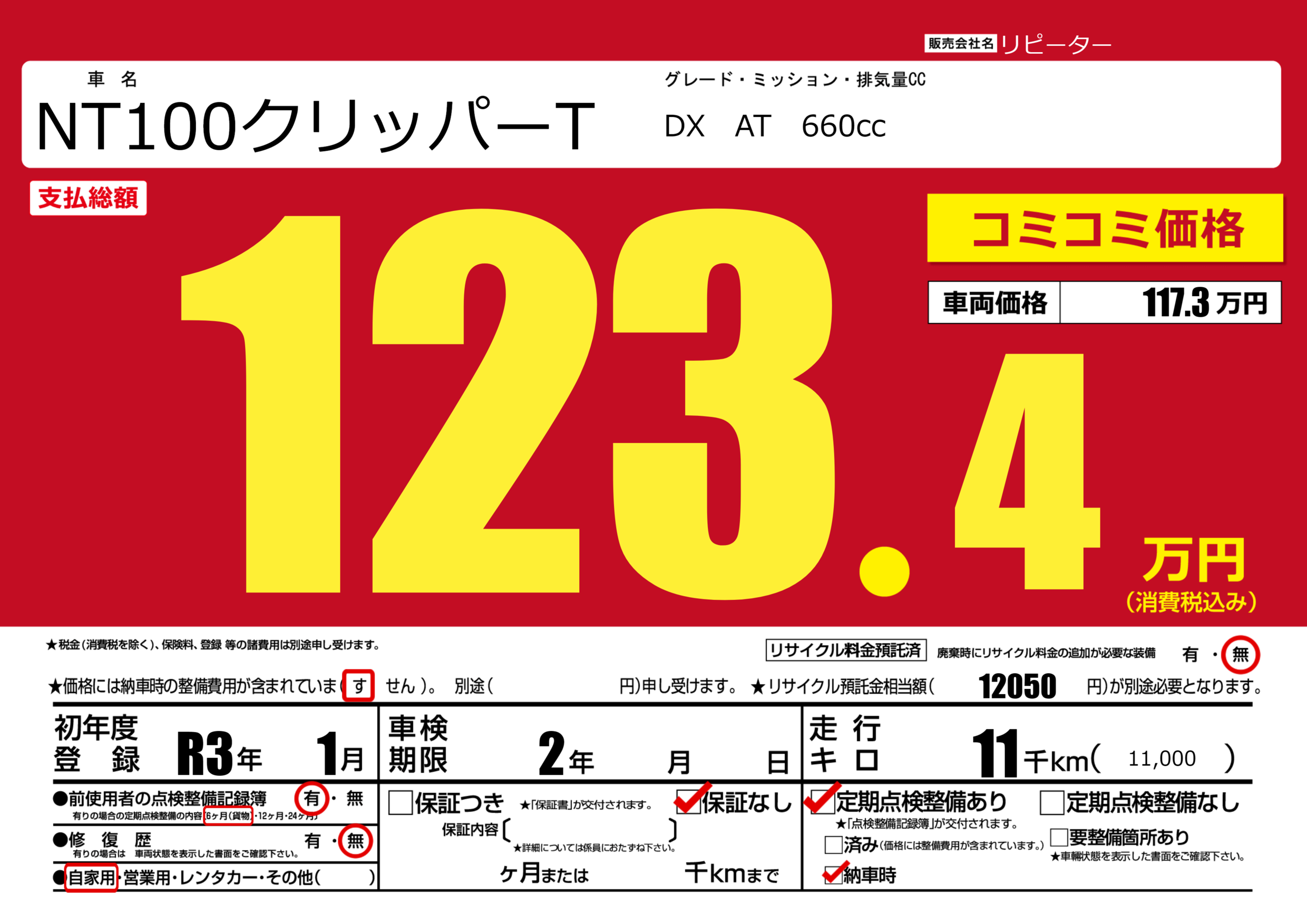 | 車名 | NT100クリッパーT | グレード ミッション 排気量 |