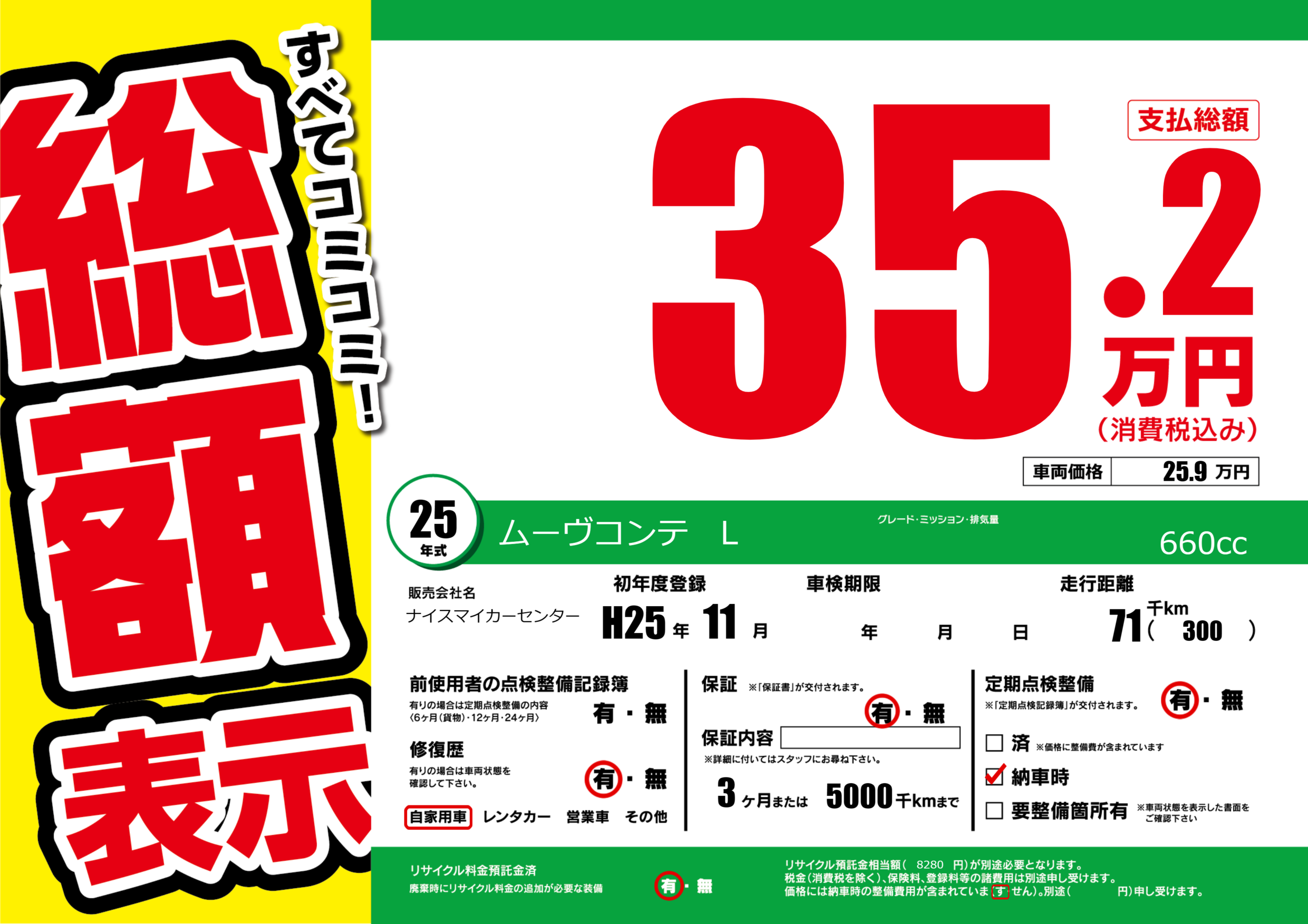 | 定期点検整備 | 定期点検整備あり 納車時あり | ||
