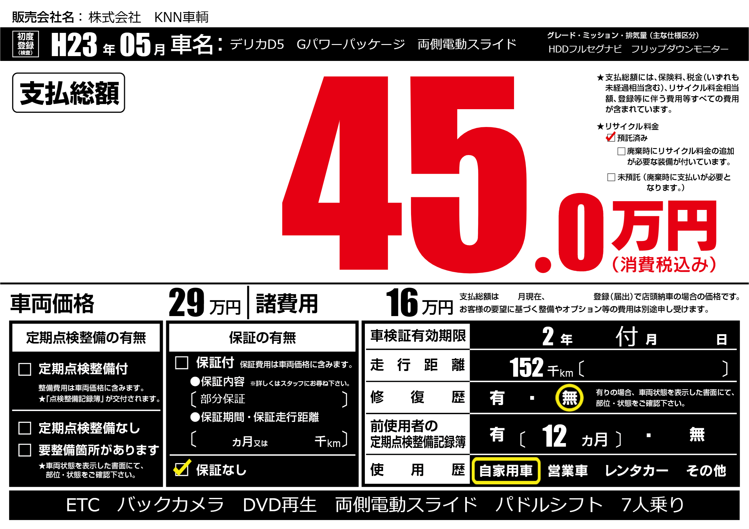 | 車名 | デリカD5 Gパワーパッケージ 両側電動スライド | グレード ミッション 排気量 |