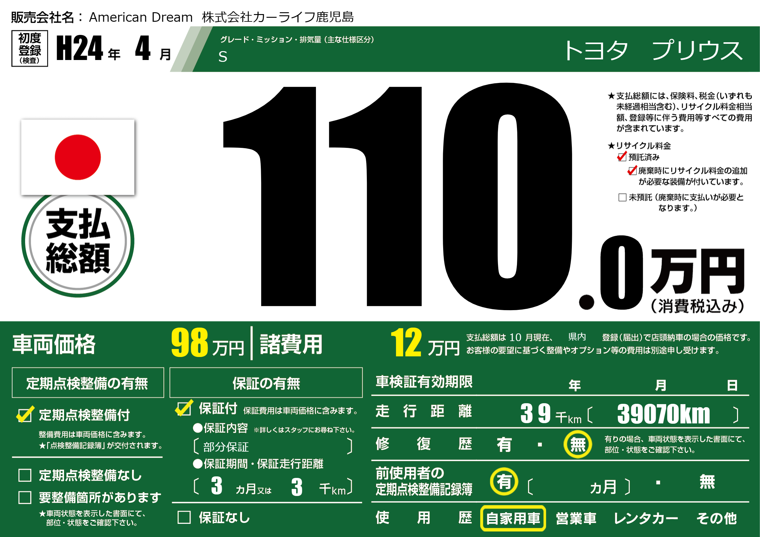 | 車名 | トヨタ プリウス | グレード ミッション 排気量 |