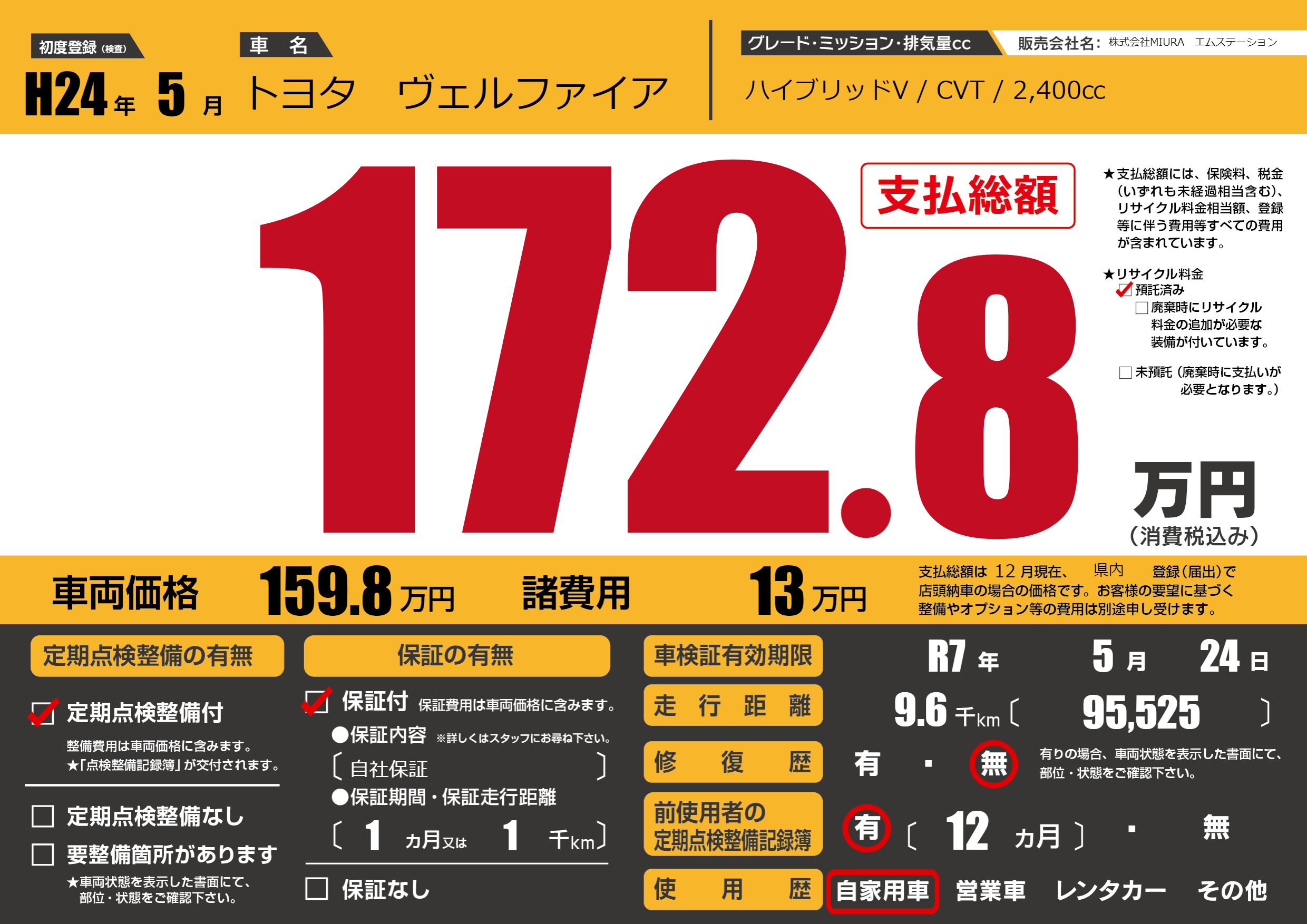 | 車名 | トヨタ ヴェルファイア | グレード ミッション 排気量 |