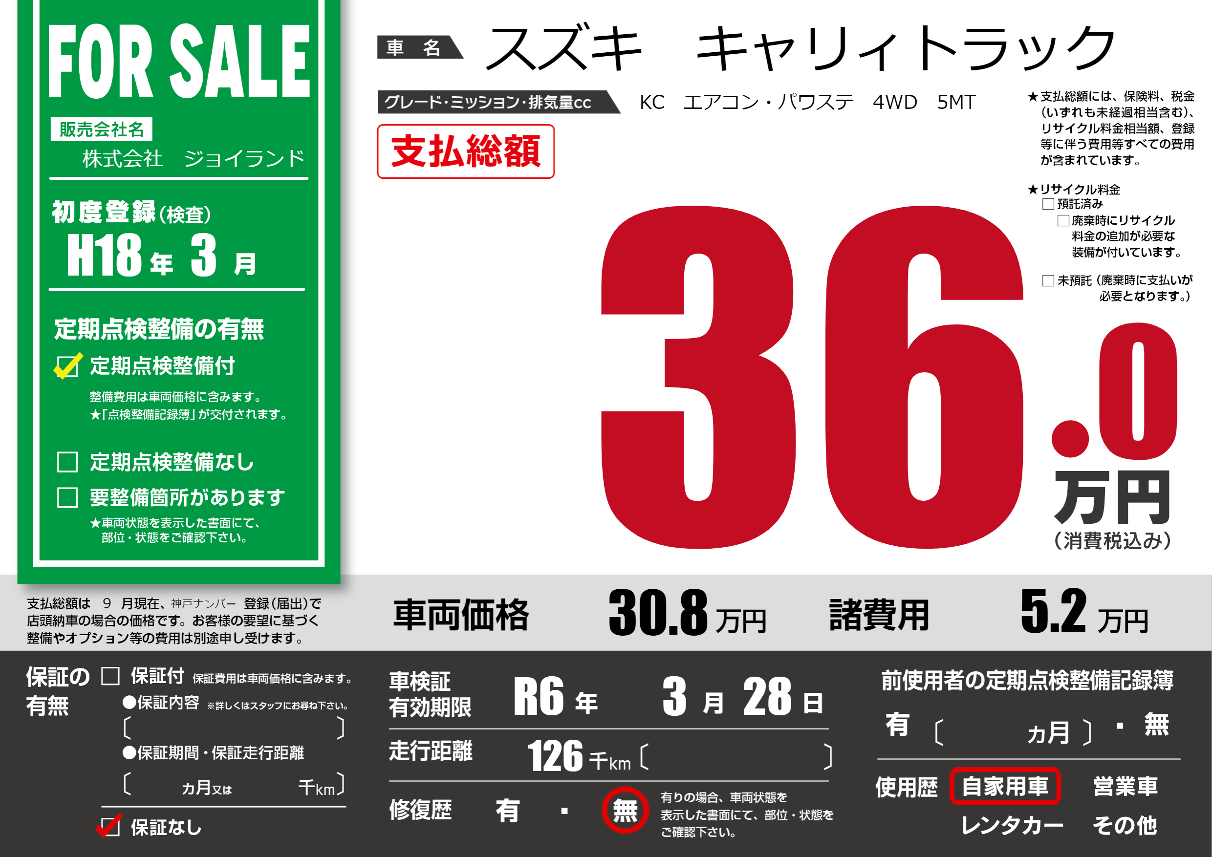 | 走行キロ | 12.6万km | 初年度登録 | H18年3月 |