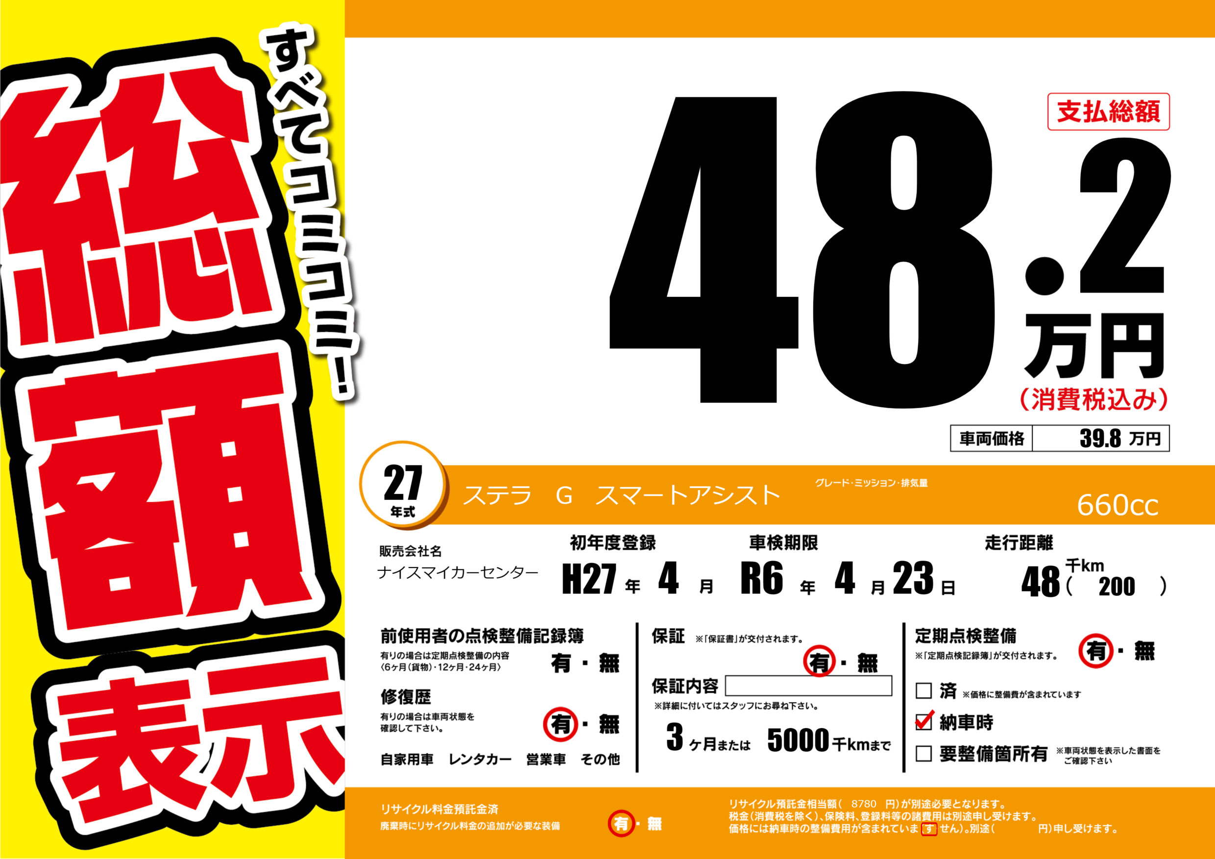 | 車名 | ステラ G スマートアシスト | グレード ミッション 排気量 |