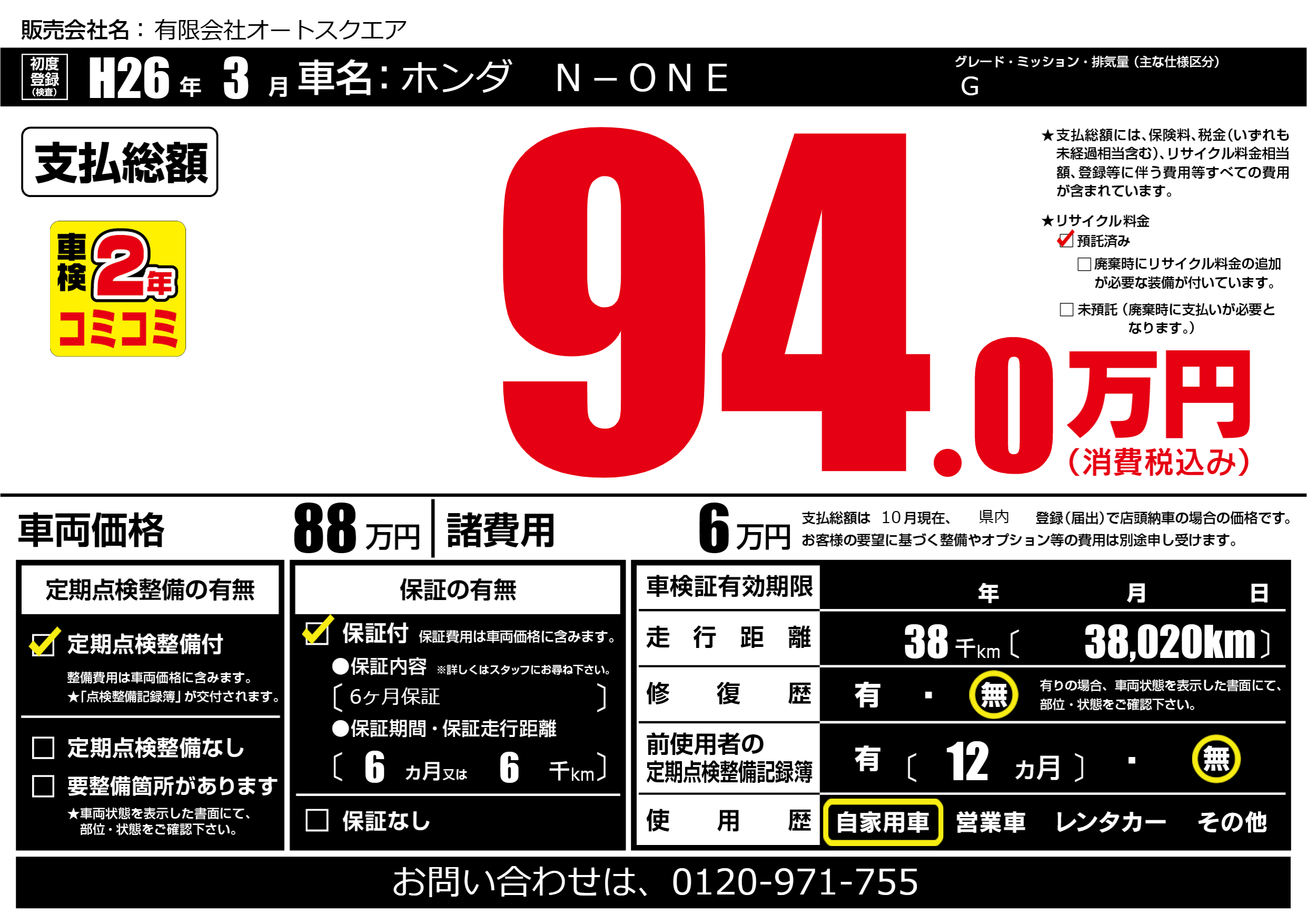 | 車名 | ホンダ N-ONE | グレード ミッション 排気量 |