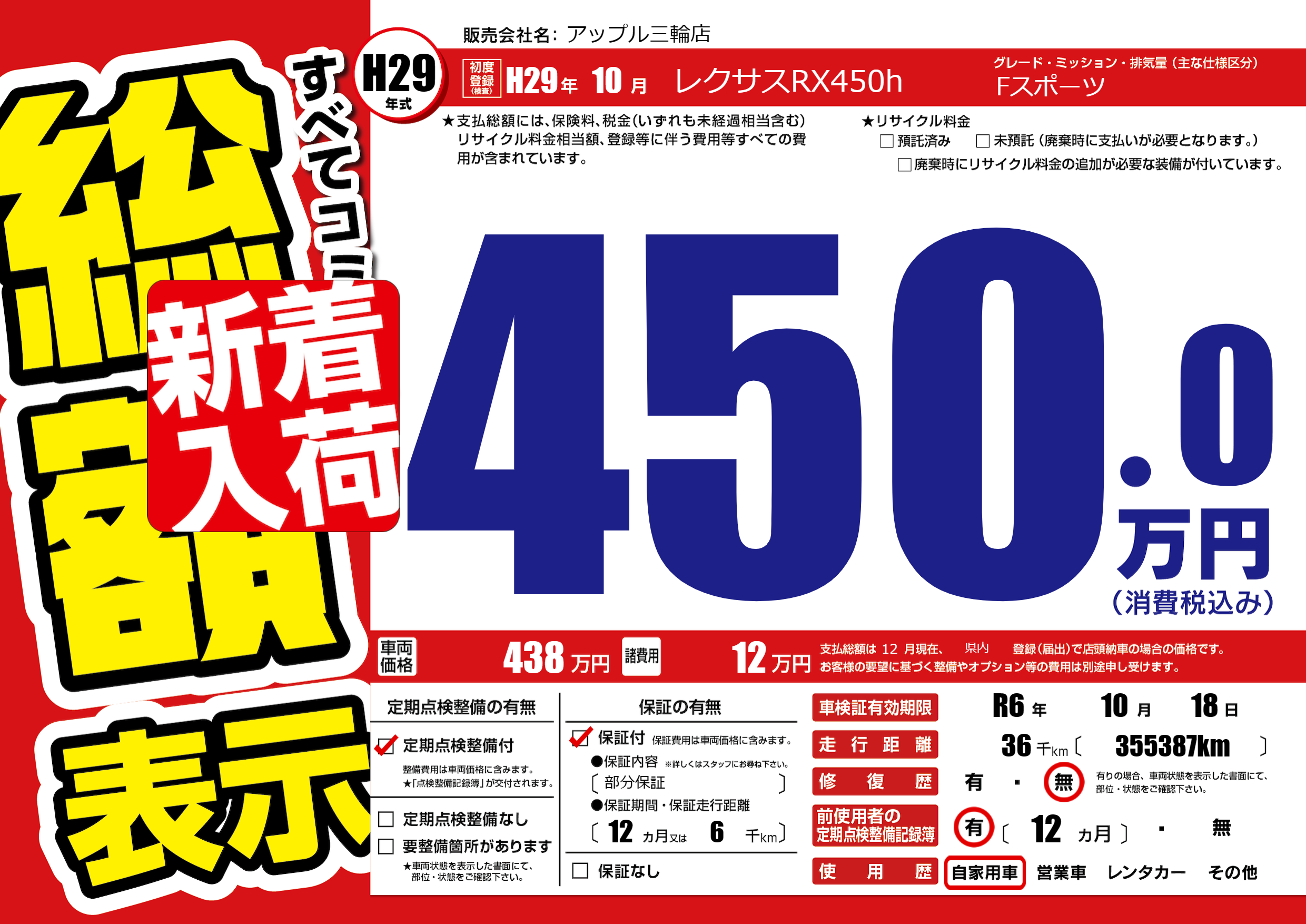 | 車名 | レクサスRX450h | グレード ミッション 排気量 |