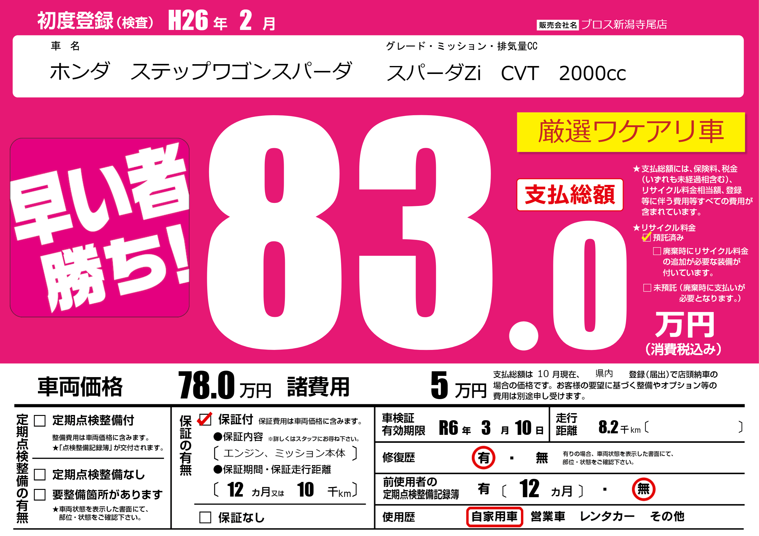 | 走行キロ | 0.8万km | 初年度登録 | H26年2月 |