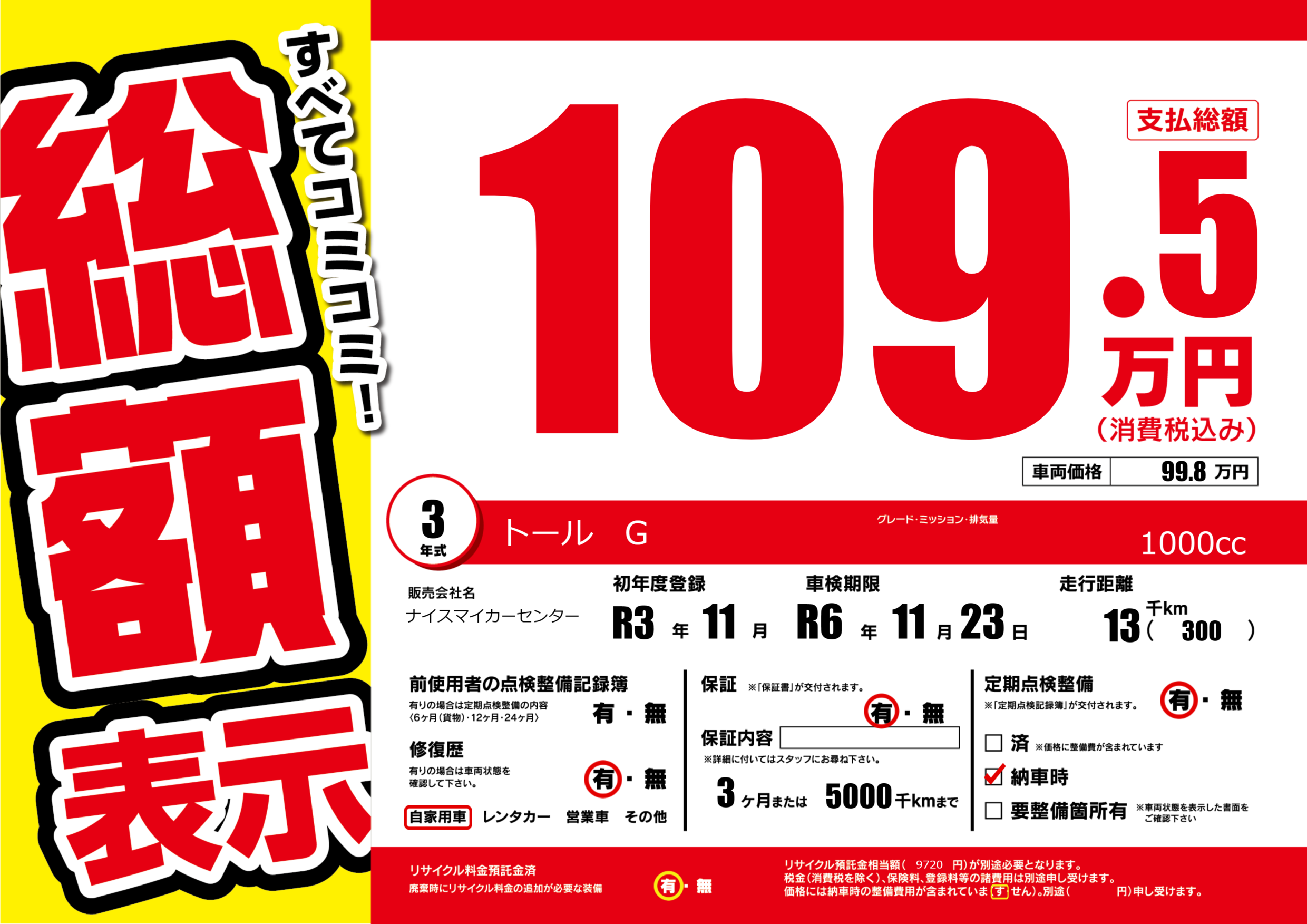 | 定期点検整備 | 定期点検整備あり 納車時あり | ||