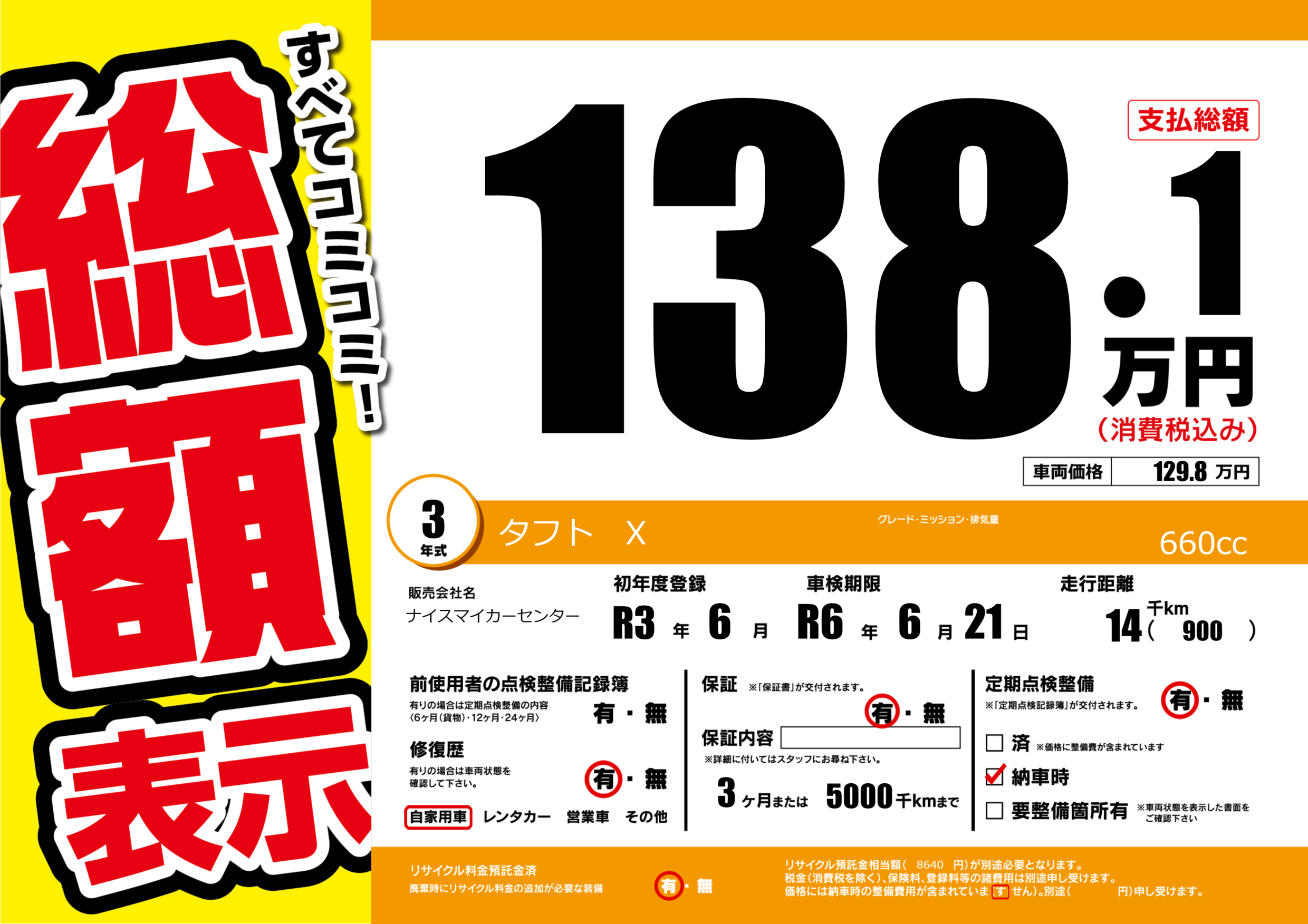 | 定期点検整備 | 定期点検整備あり 納車時あり | ||