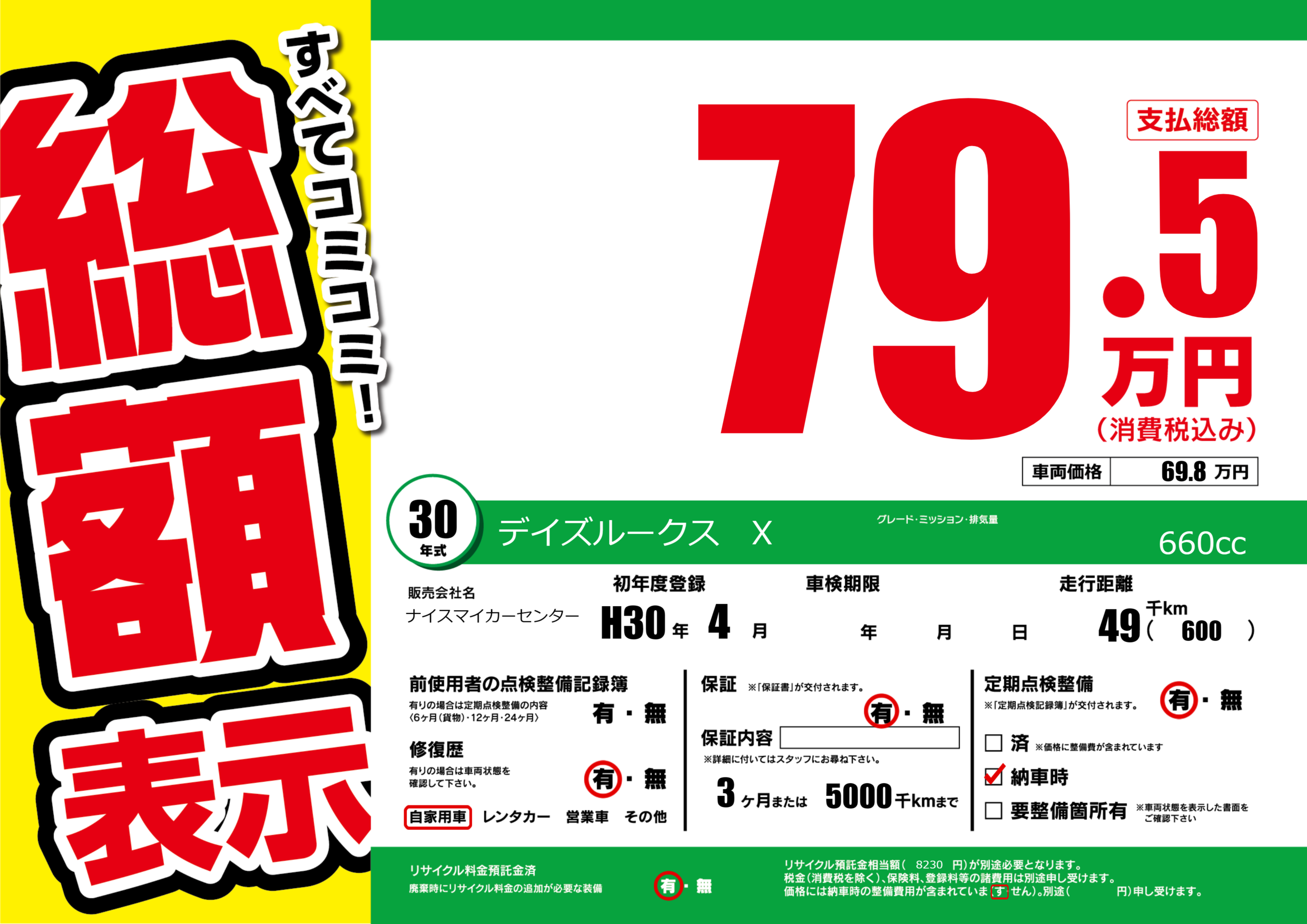 | 定期点検整備 | 定期点検整備あり 納車時あり | ||