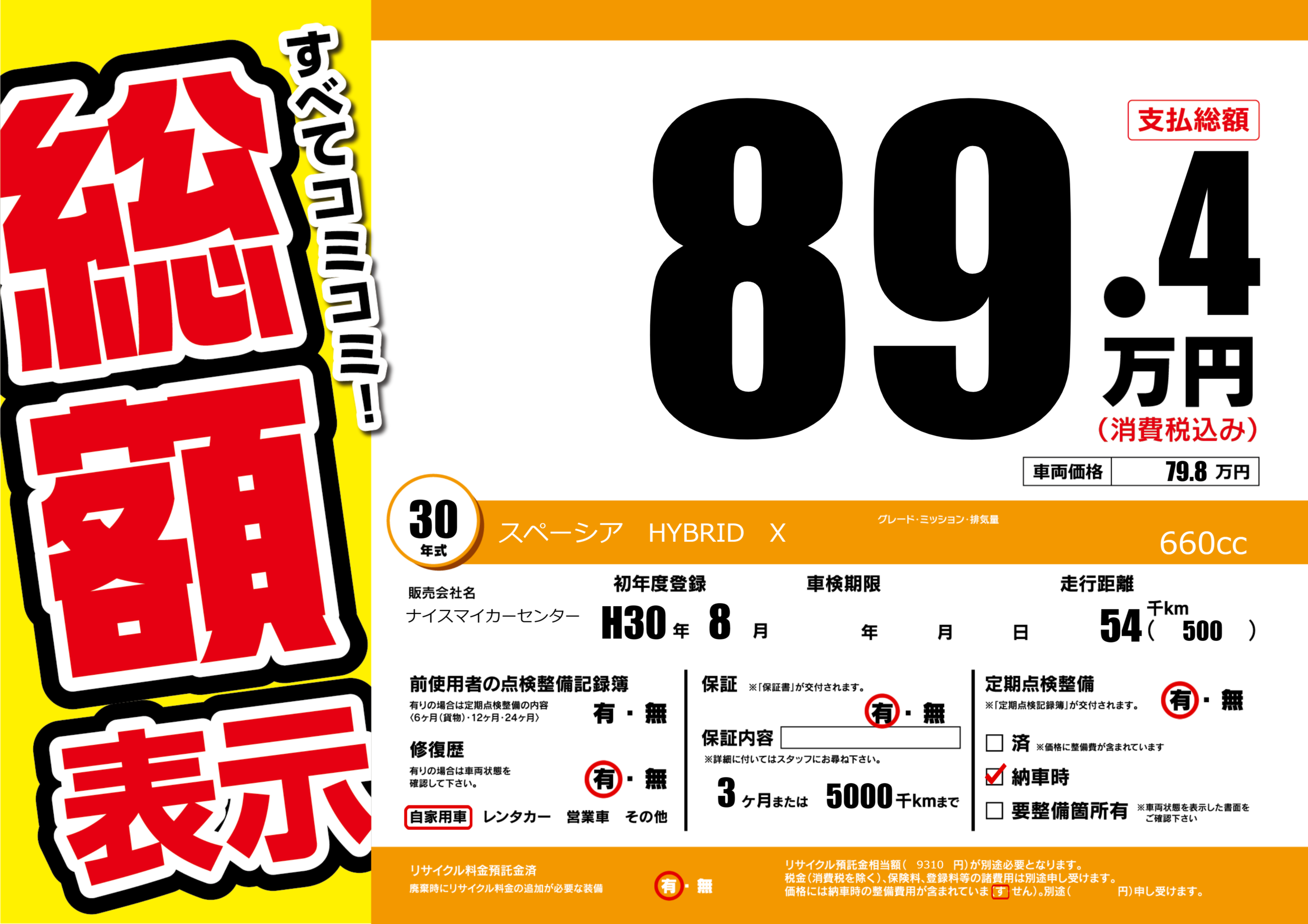 | 定期点検整備 | 定期点検整備あり 納車時あり | ||