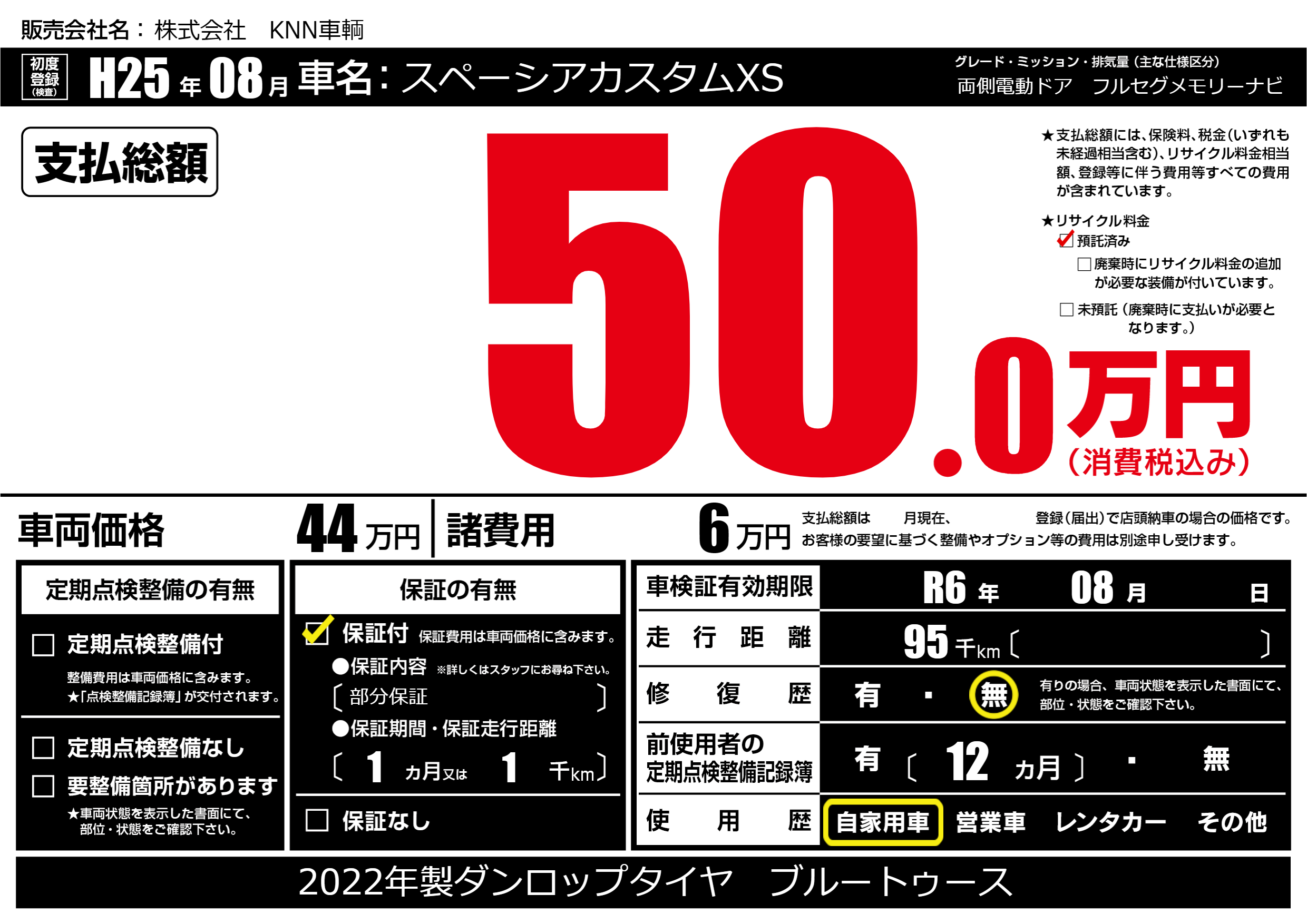 | 走行キロ | 9.5万km | 初年度登録 | H25年08月 |
