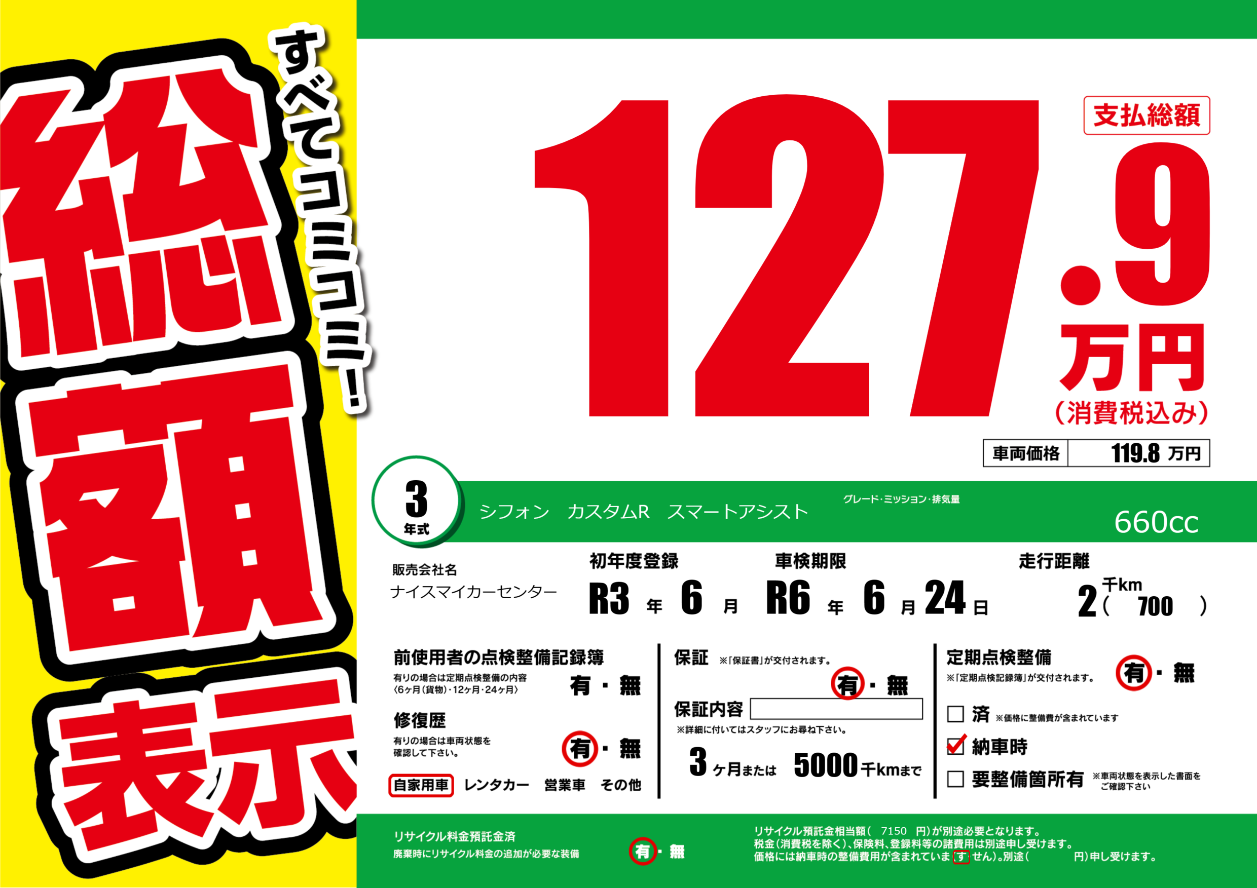 | 定期点検整備 | 定期点検整備あり 納車時あり | ||