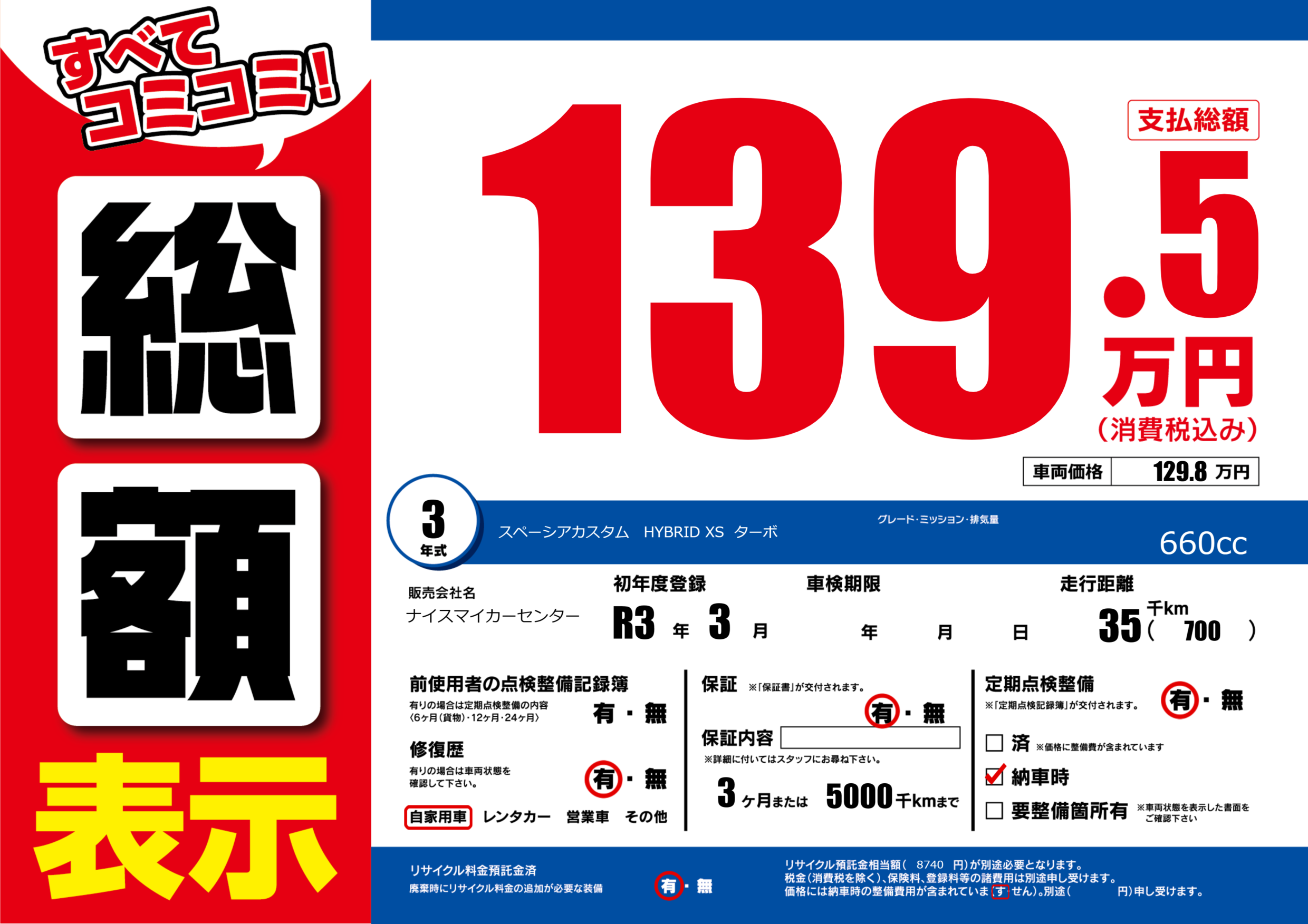 | 定期点検整備 | 定期点検整備あり 納車時あり | ||