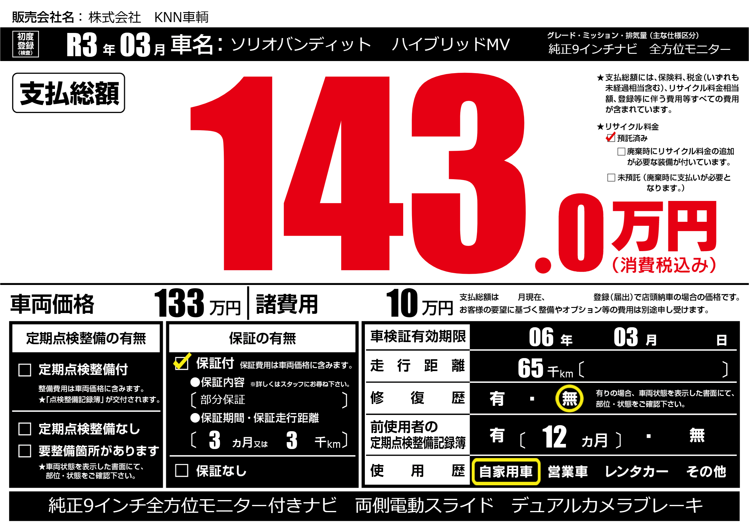 | 走行キロ | 6.5万km | 初年度登録 | R3年03月 |