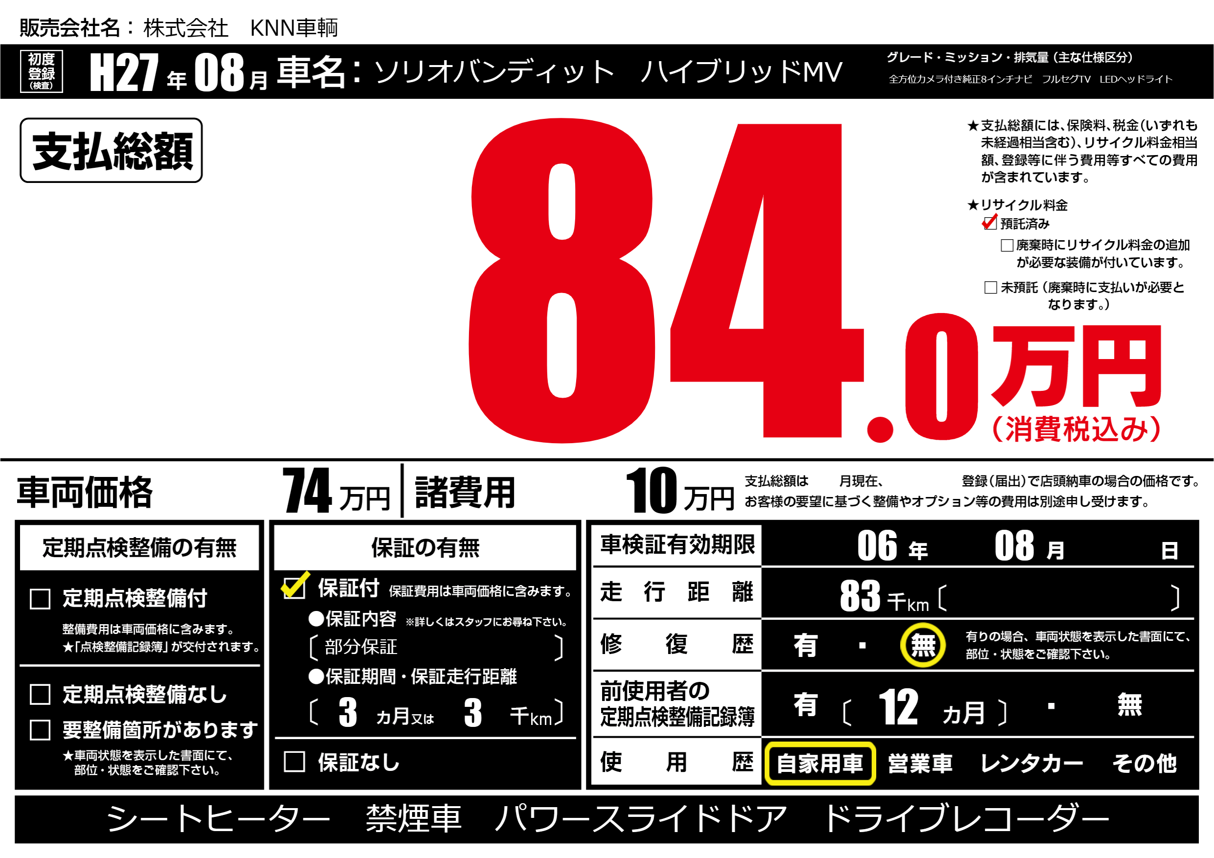 | 走行キロ | 8.3万km | 初年度登録 | H27年08月 |