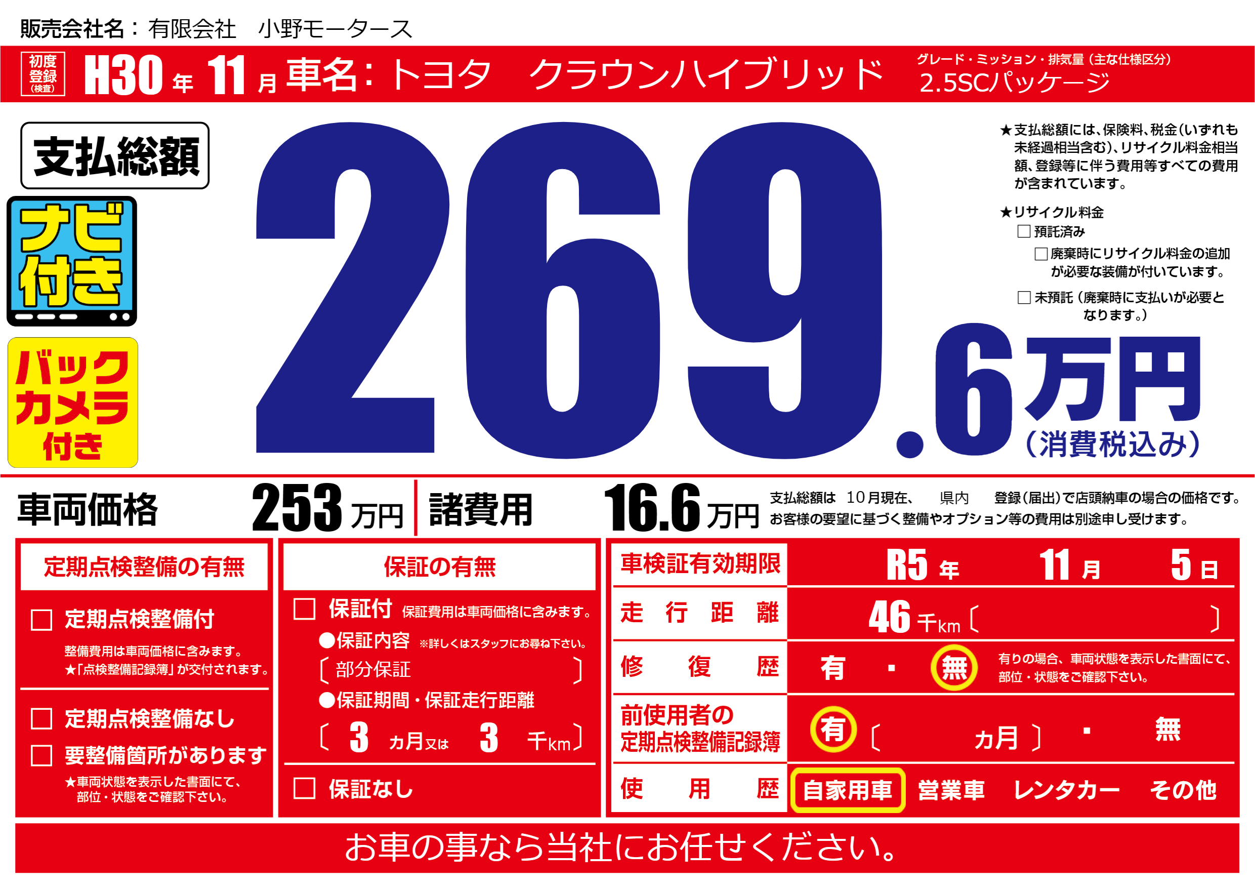 | 車名 | トヨタ クラウンハイブリッド | グレード ミッション 排気量 |