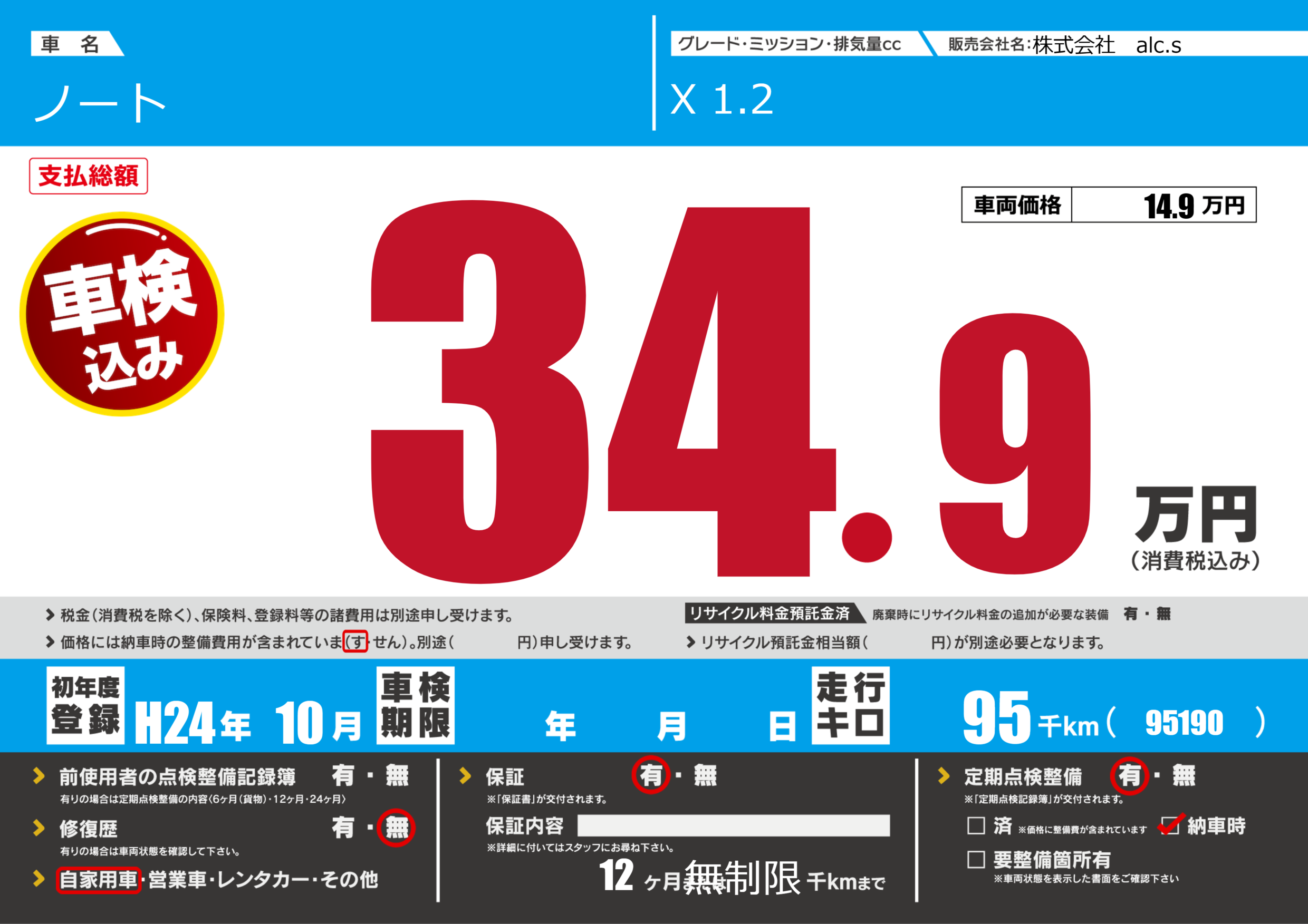 | 定期点検整備 | 定期点検整備あり 納車時あり | ||