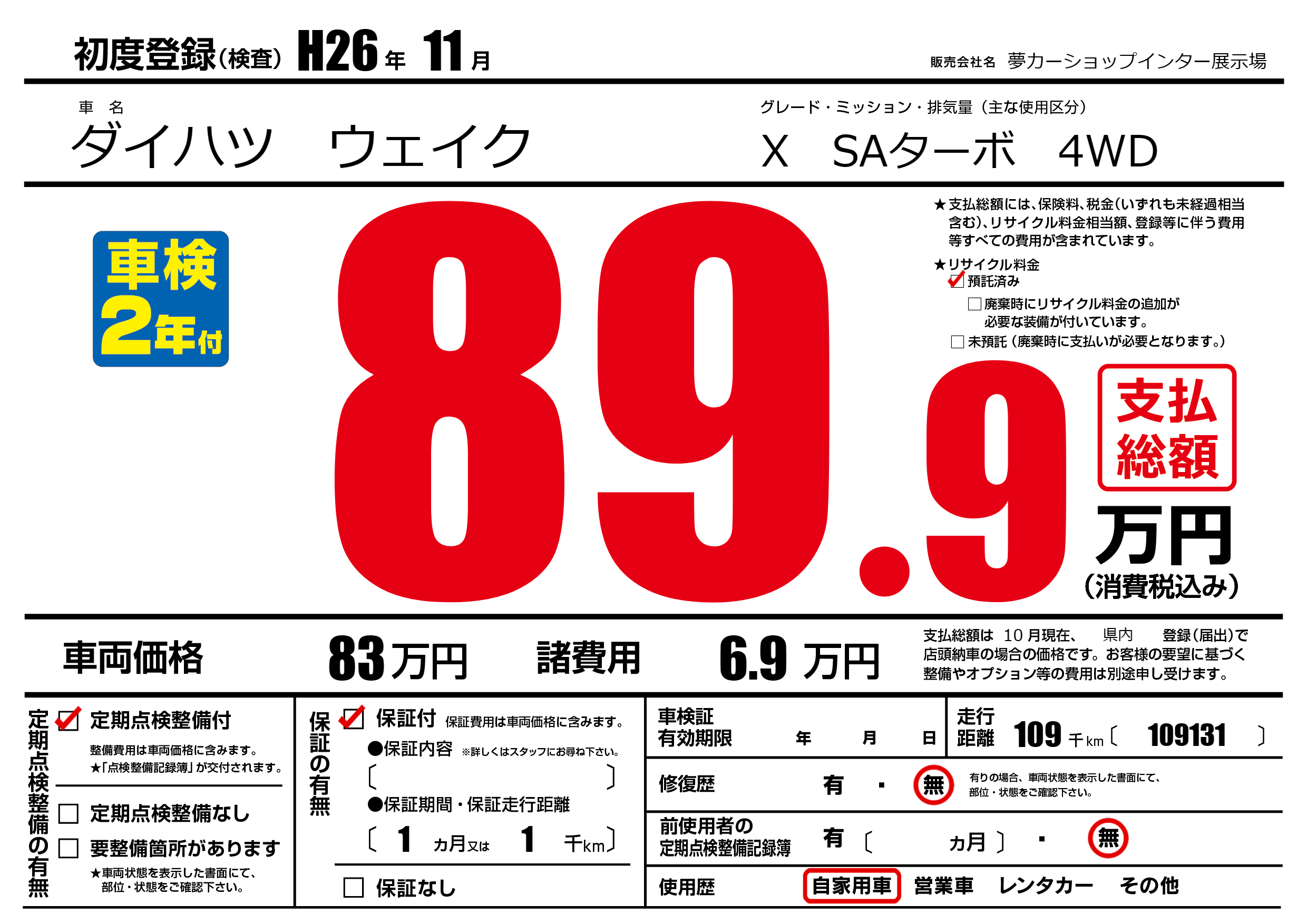 | 走行キロ | 10.9万km | 初年度登録 | H26年11月 |