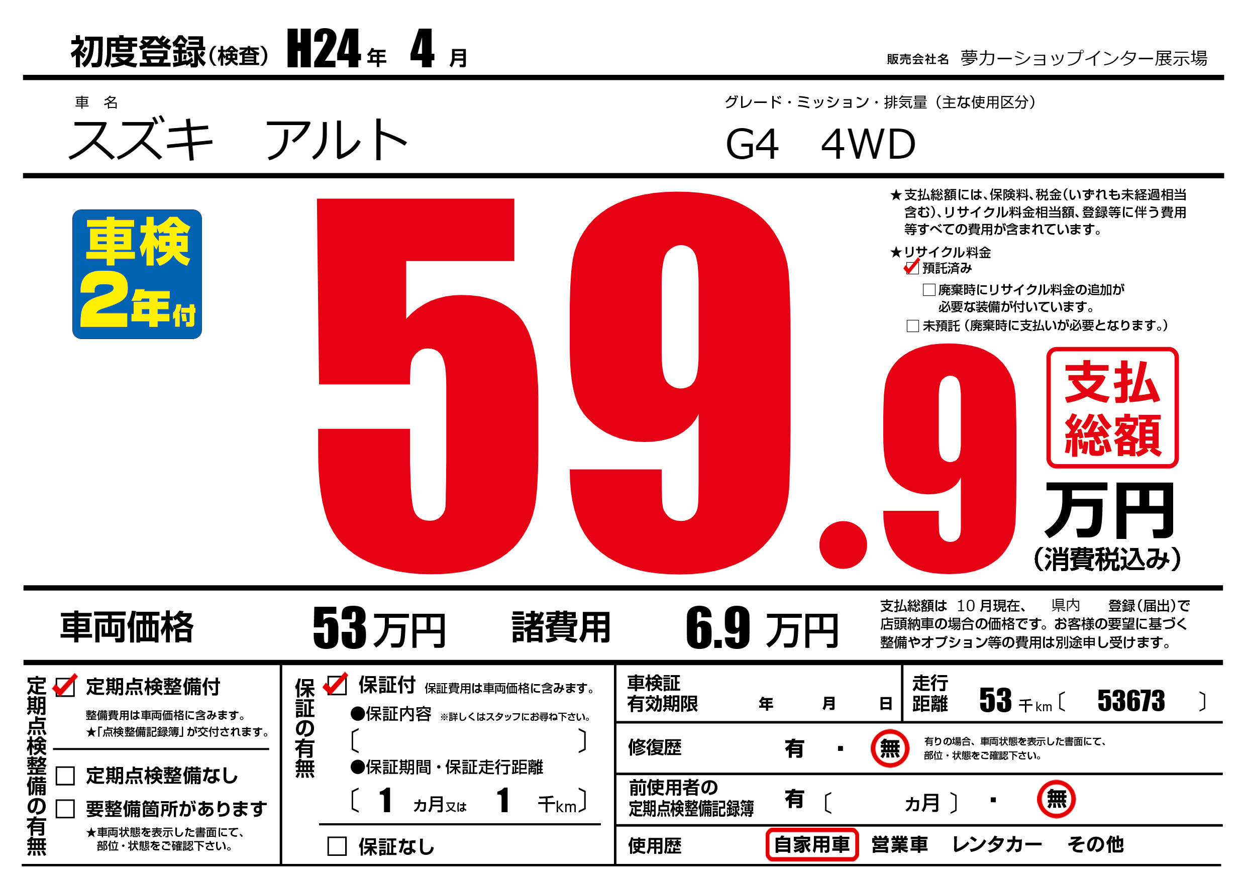 | 車名 | スズキ アルト | グレード ミッション 排気量 |