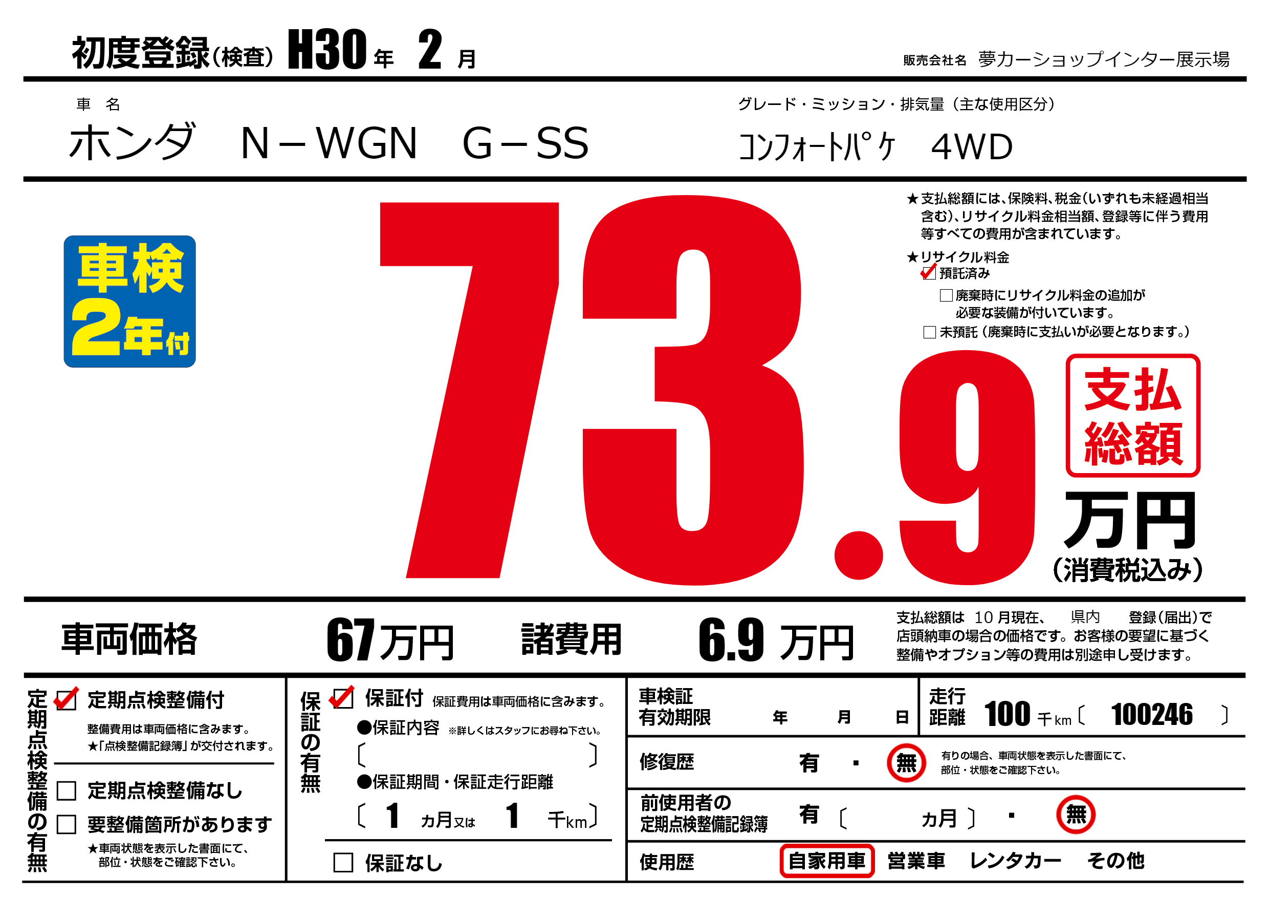 | 車名 | ホンダ N-WGN G-SS | グレード ミッション 排気量 |