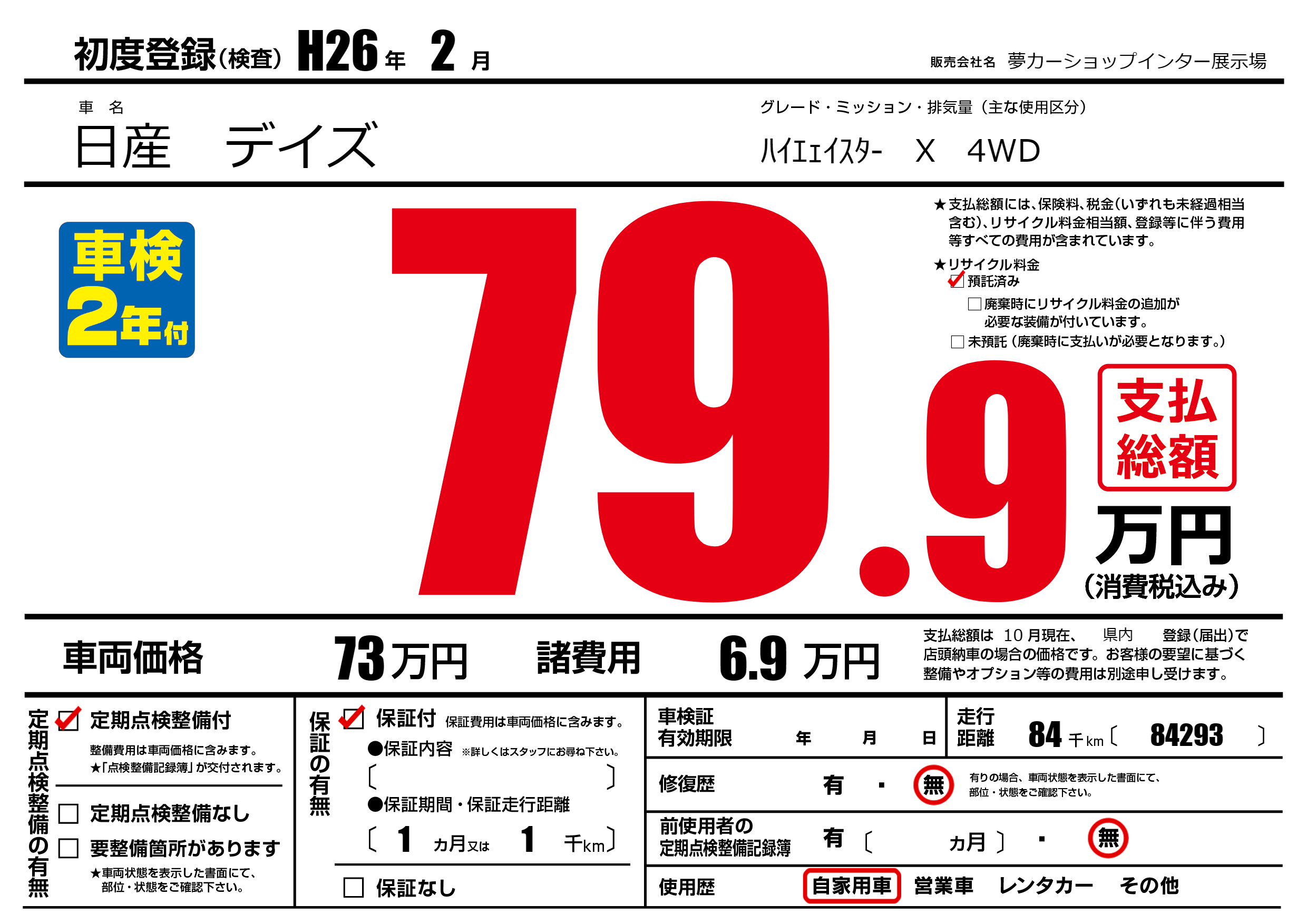 | 車名 | 日産 デイズ | グレード ミッション 排気量 |