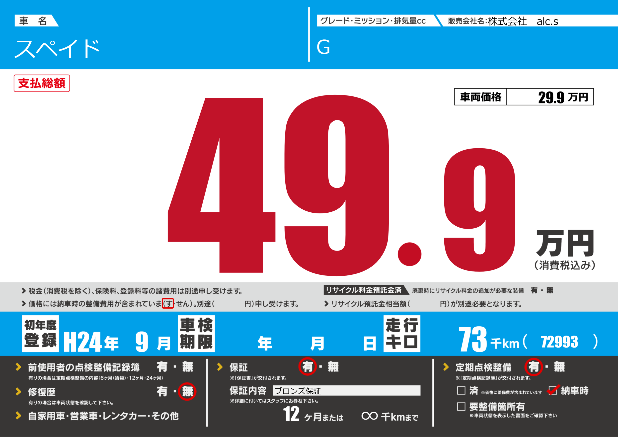 | 定期点検整備 | 定期点検整備あり 納車時あり | ||
