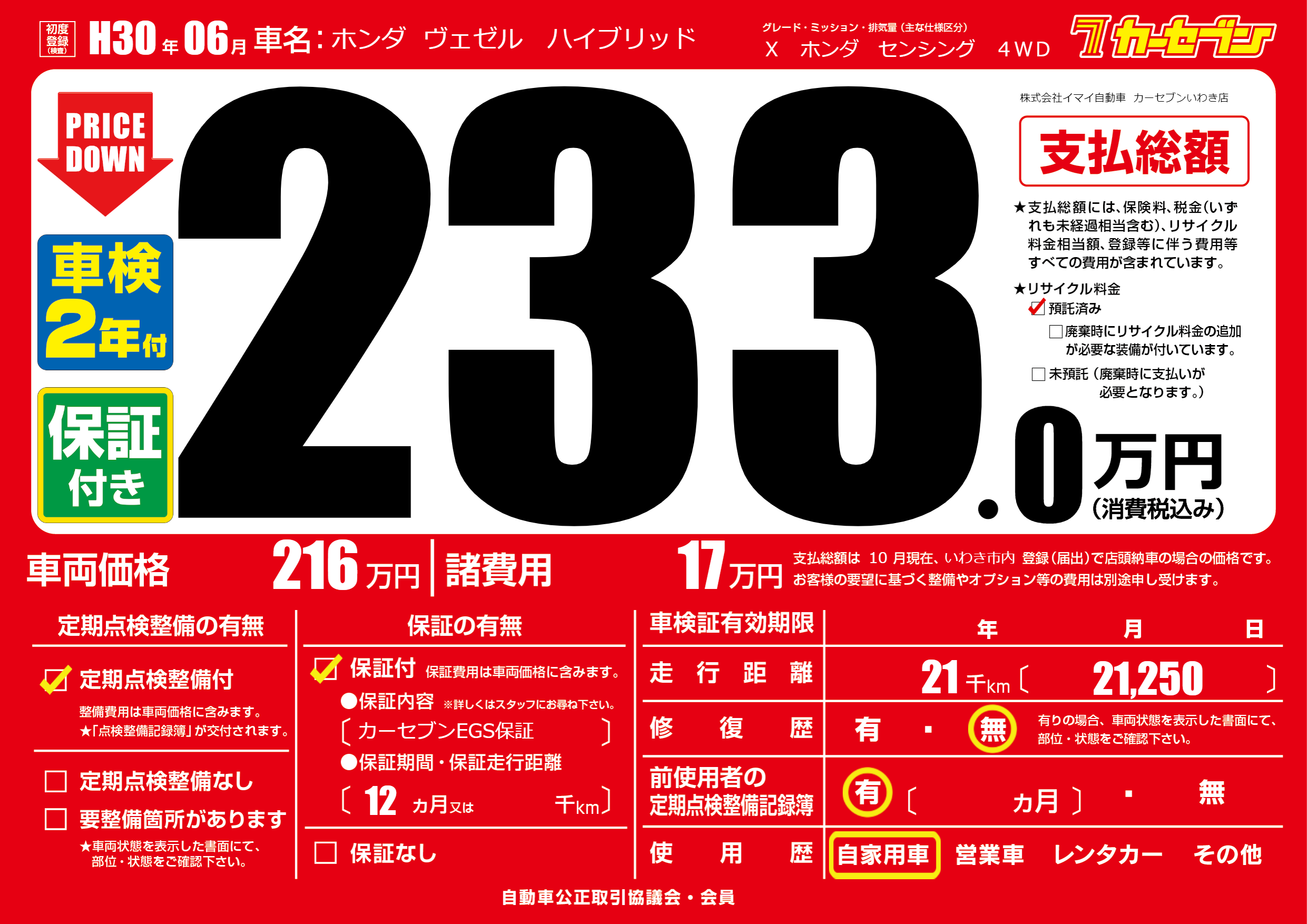 | 車名 | ホンダ ヴェゼル ハイブリッド | グレード ミッション 排気量 |