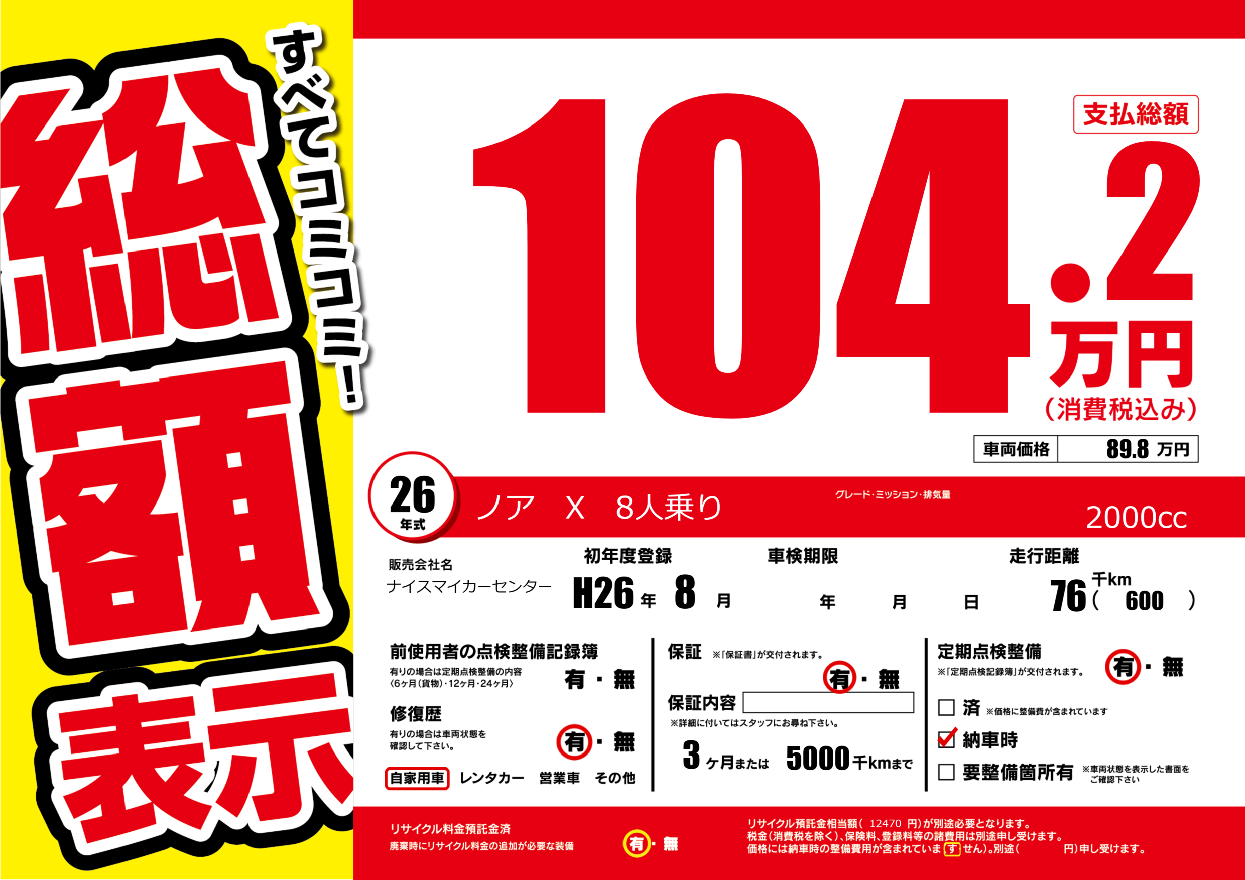 | 定期点検整備 | 定期点検整備あり 納車時あり | ||