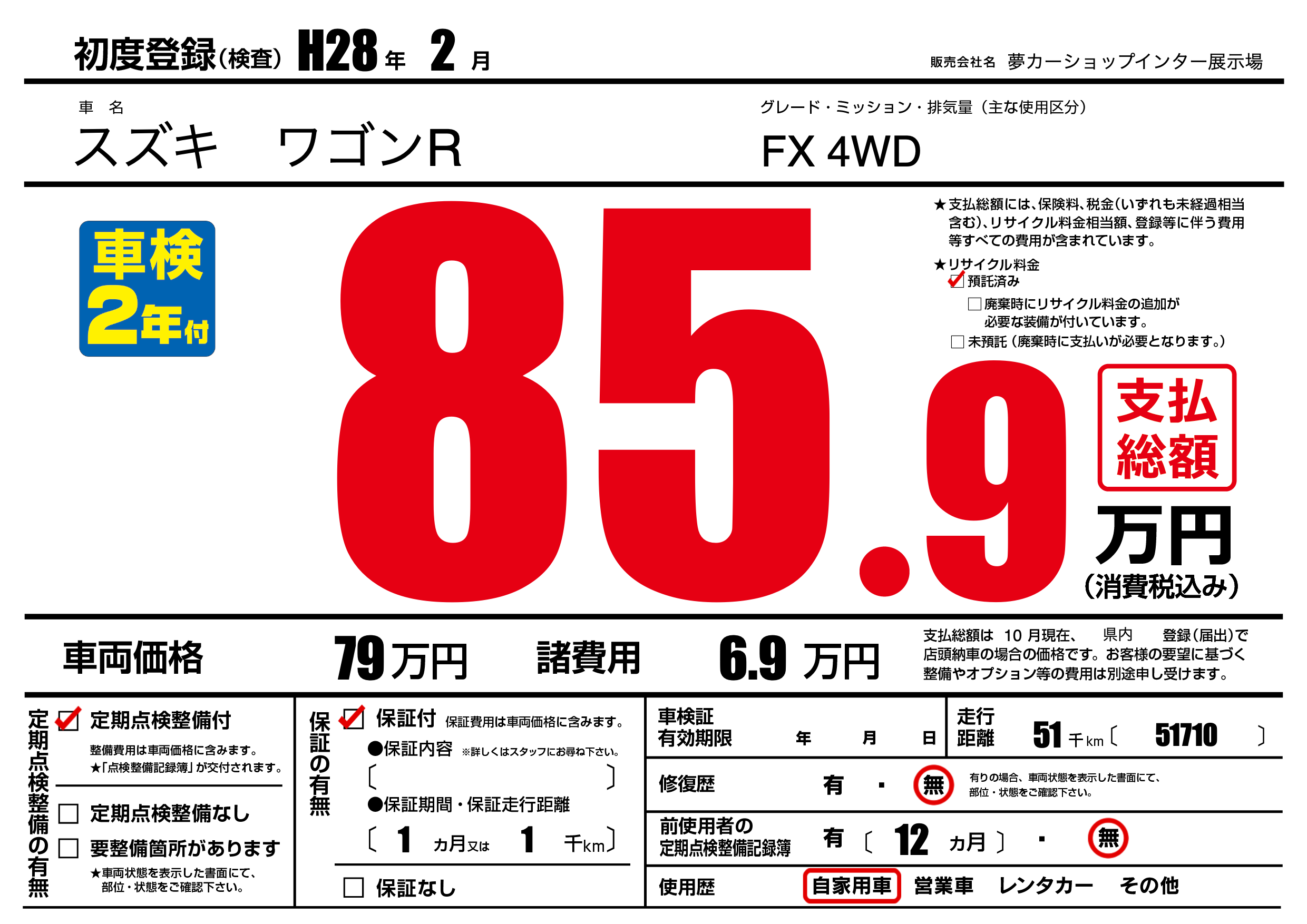 | 車名 | スズキ ワゴンR | グレード ミッション 排気量 |