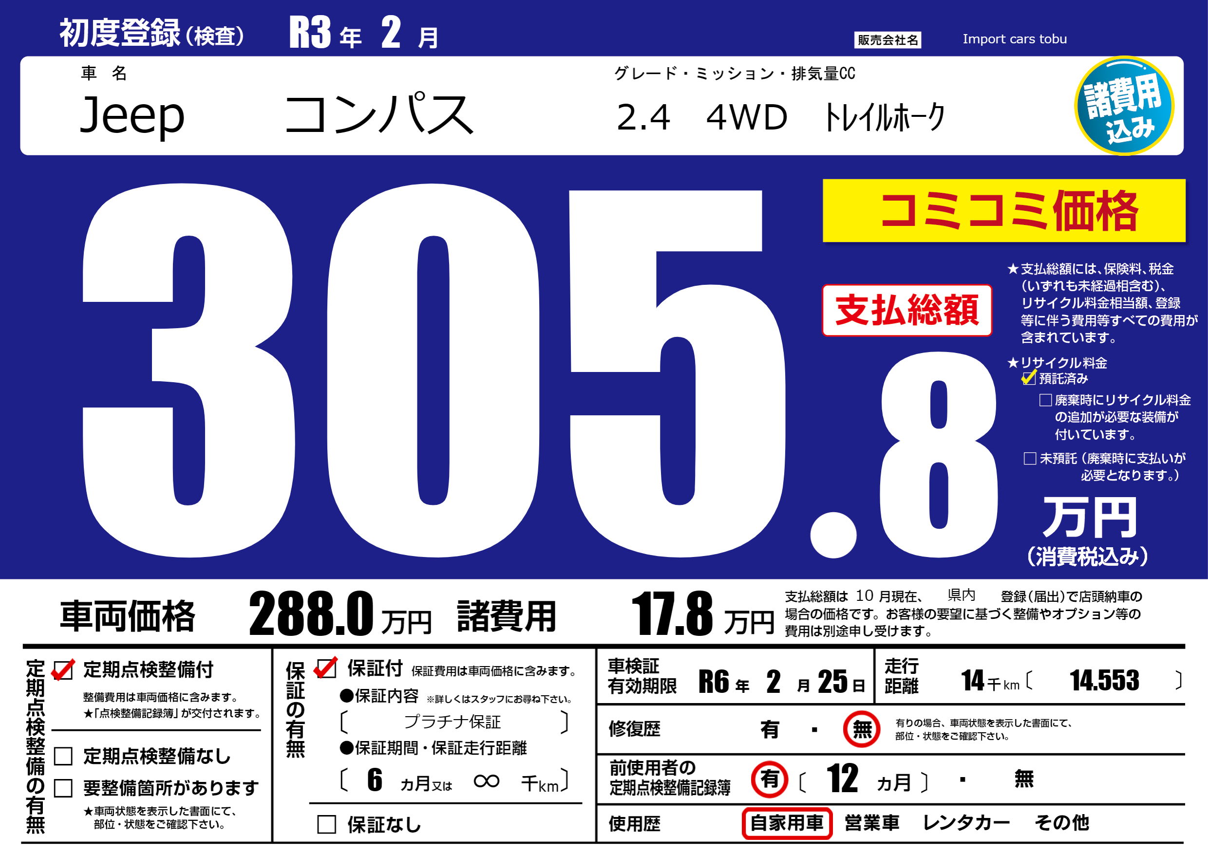 保証付き 保証内容( プラチナ保証) 6ヶ月または(∞)千kmまで |