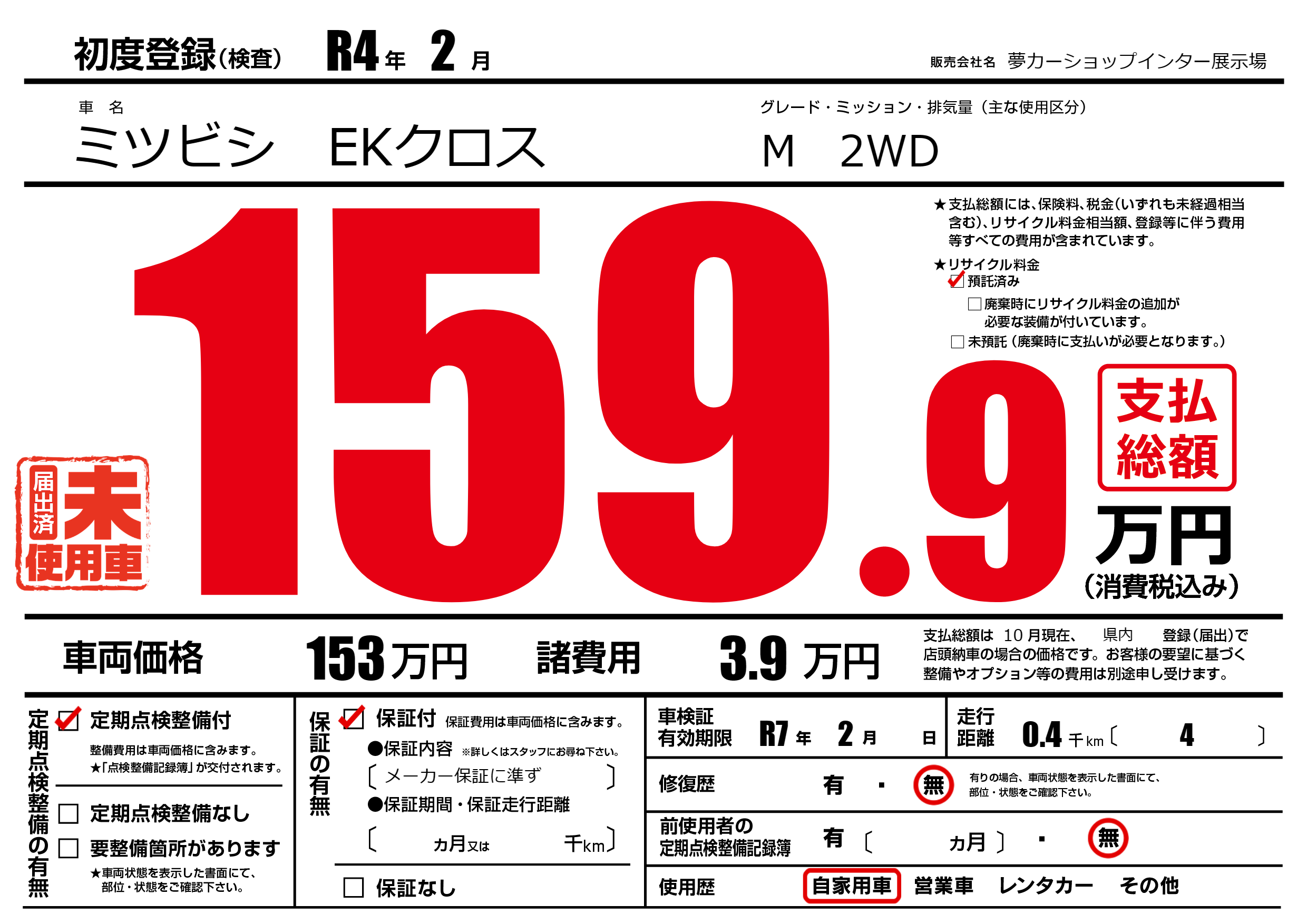 保証付き 保証内容(メーカー保証に準ず) ---ヶ月または()千kmまで |