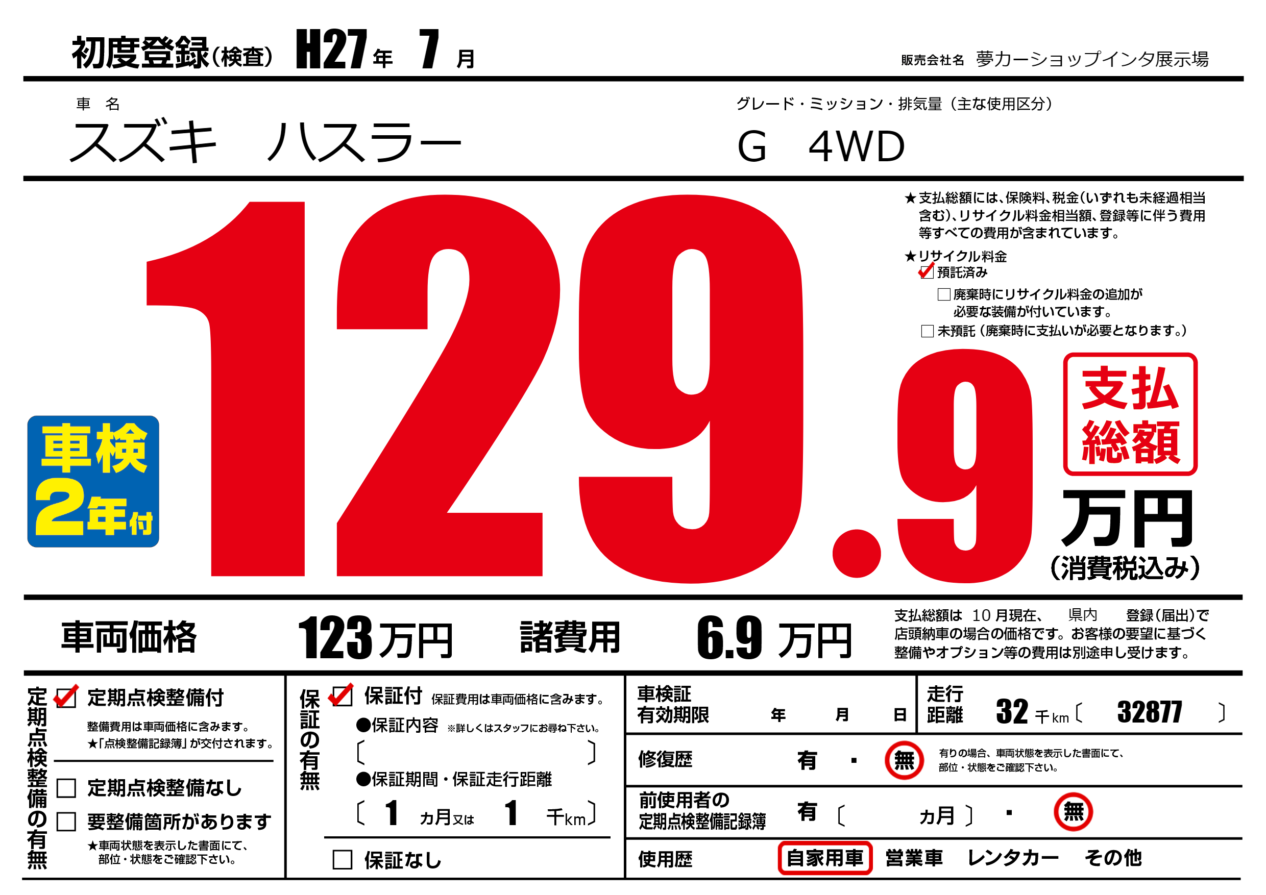 | 走行キロ | 3.2万km | 初年度登録 | H27年7月 |