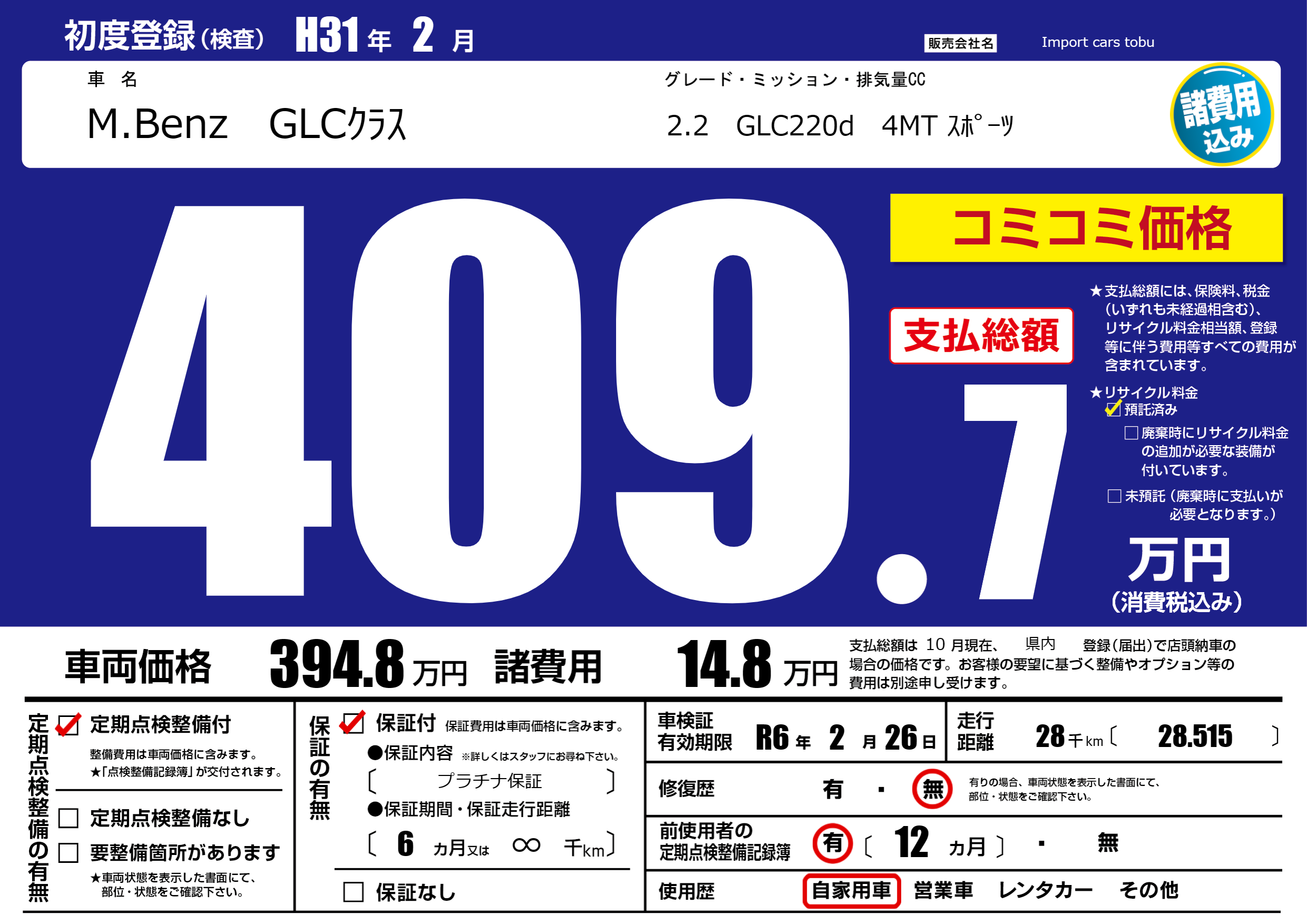 | 車名 | M.Benz GLCクラス | グレード ミッション 排気量 |