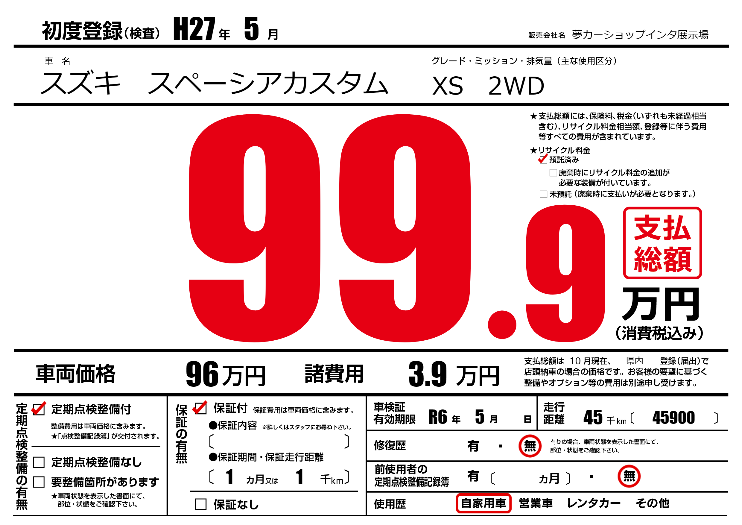 | 車名 | スズキ スペーシアカスタム | グレード ミッション 排気量 |